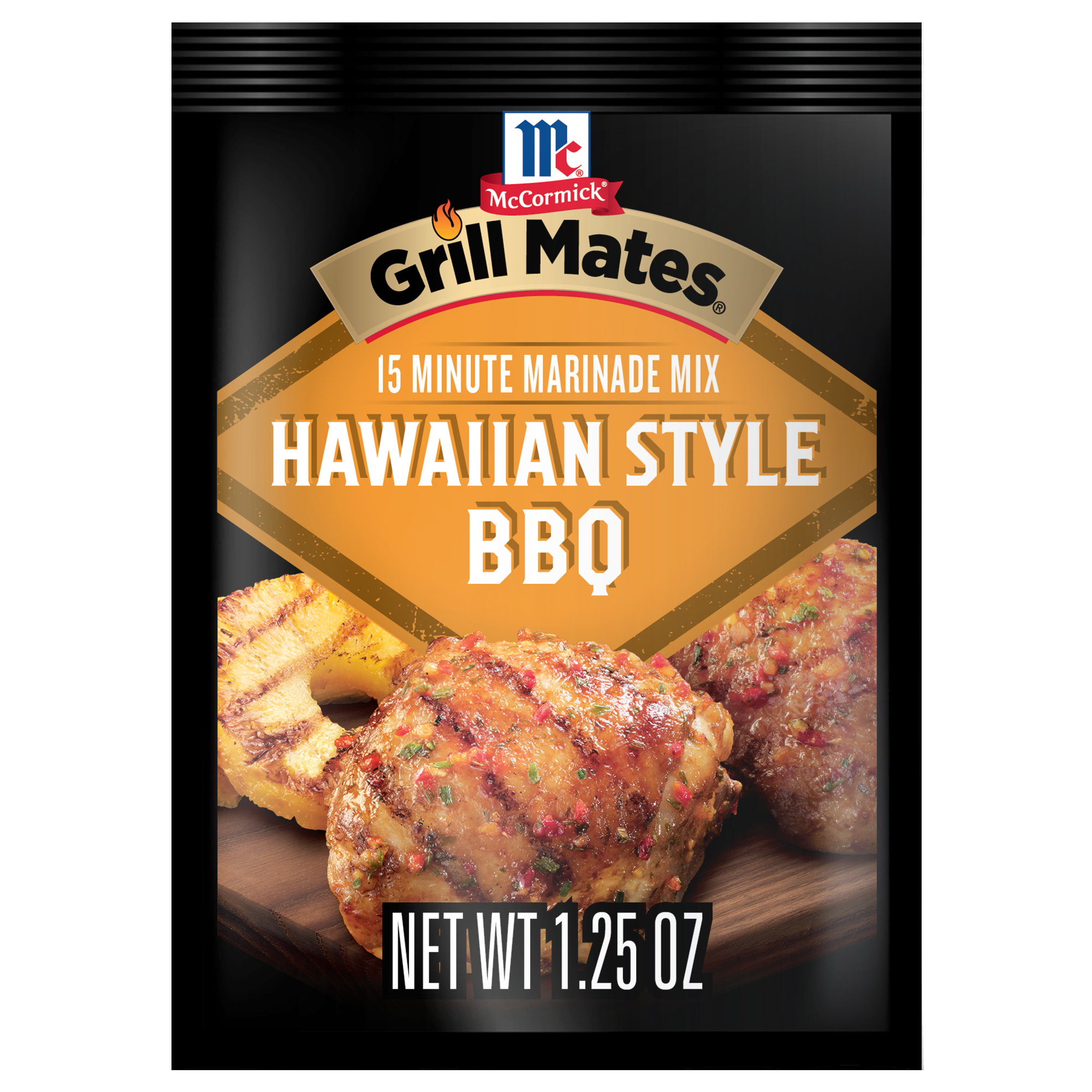 Extra Long Description McCormick Grill Mates Hawaiian Style BBQ 15 Minute Marinade Mix is a quick way to add lively, Hawaiian-inspired flavor to whatever you're grilling up. This brown sugar marinade is especially delicious on chicken, pork, and seafood. Bring big island flavor to the grill, the air fryer, or top of the stove with Hawaiian Style BBQ Marinade. It's made with an inspired blend of sugars, garlic, onion, pineapple juice, and ginger to add the warm, sunny flavors of a Hawaiian barbecue to your meals. To prepare the marinade, mix with oil, cider or white vinegar, and soy sauce. Pour over 2 pounds chicken, pork, or seafood and marinate for 15 minutes before grilling. Entertaining family and friends island-style? Prepare the marinade with rum, brown sugar, lime juice, and oil, and use to marinate shrimp for shrimp tacos or brush on pineapple and vegetable kabobs. With McCormick Grill Mates Hawaiian Style BBQ Marinade Mix, 15 minutes is all you need to add savory sweetness to all that goes on the grill. Feature 1 HAWAIIAN BARBECUE FLAVOR: Hawaiian-style marinade with the savory and fruity flavors of island barbecues. Feature 2 FLAVORFUL INGREDIENTS: Hawaiian Style BBQ Marinade Mix is a flavorful blend of brown sugar, garlic, onion, pineapple juice, and ginger. Feature 3 EASY PREPARATION: Mix with oil, cider or white vinegar, and soy sauce. Pour over 2 pounds meat and marinate for 15 minutes before grilling. Feature 4 CONVENIENT MARINADE FOR ANY MEAT: Use Hawaiian Style BBQ Marinade Mix to add lively flavor to any meat in just 15 minutes. Try on chicken, pork, shrimp, and fish like salmon or tuna steak. Great also for fruit and vegetables. Feature 5 VERSATILE USE: Hawaiian-style marinade is an easy way to add memorable flavor to all that you’re cooking. Great for the grill as well as for air fried, broiled, or pan seared meals. Preparation Instructions To prepare McCormick Grill Mates Hawaiian Style BBQ 15 Minute Marinade Mix: Whisk Marinade Mix with 1/4 cup oil, 2 tbsp cider or white vinegar, and 2 tbsp soy sauce in a bowl. Reserve 2 tbsp marinade for basting. Place 2 lbs chicken, pork, or seafood* and remaining marinade in a resealable plastic bag. Refrigerate 15 minutes or longer. Remove meat from marinade. Discard any remaining marinade. Grill until cooked through, basting with reserved marinade during last few minutes of cooking. *Do not marinate seafood longer than 30 minutes. Storage Instructions Store McCormick Grill Mates Hawaiian Style BBQ 15 Minute Marinade Mix in a cool, dry place, to protect against flavor loss and moisture. Avoid exposure to heat, humidity, direct sunlight, and fluorescent light to maintain flavor and color. Always use dry measuring spoons and cups to ensure optimal product integrity. Shelf life: 720 days. Benefits - No High Fructose