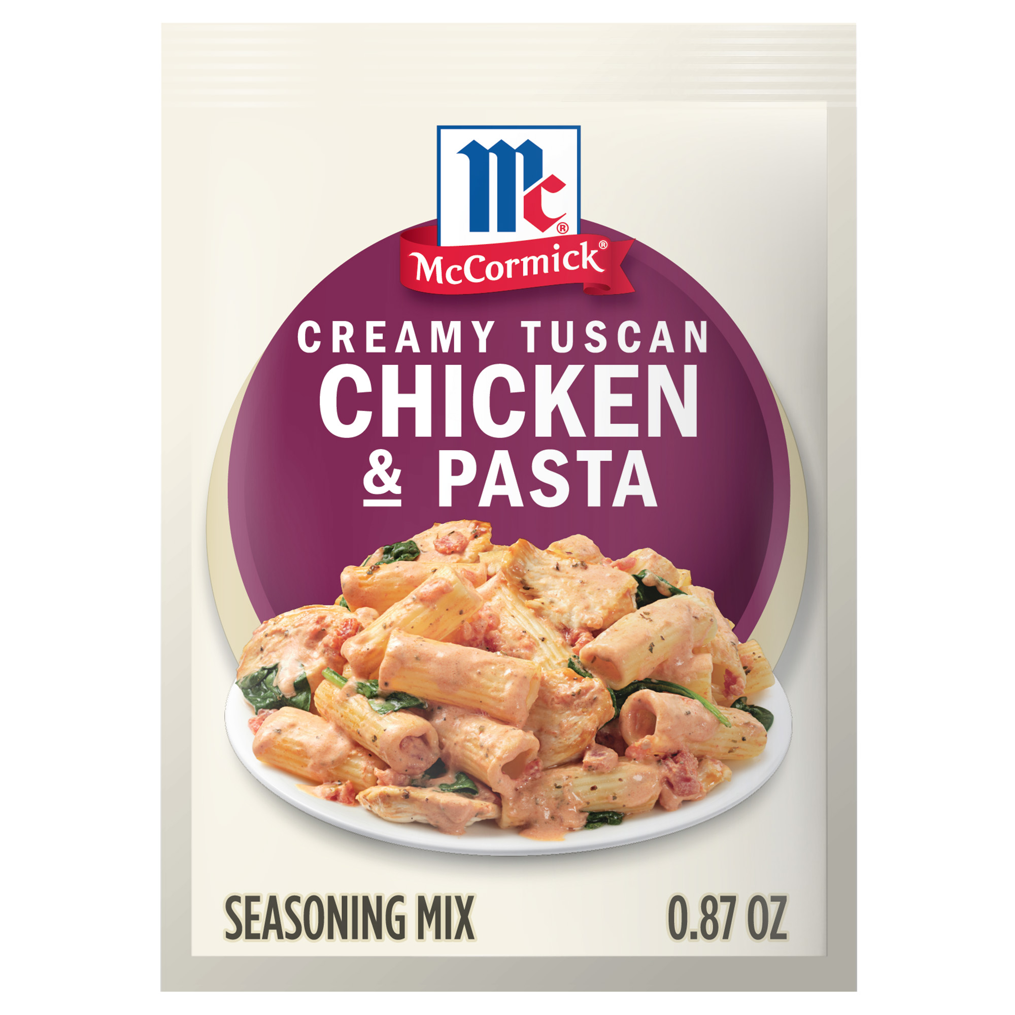 - What’s for dinner? McCormick® Creamy Tuscan Chicken & Pasta Seasoning Mix helps you put together a complete meal that contains a protein, vegetable, and starch. In just 30 minutes, you can have a creamy, Italian-inspired dinner on the table that’s perfect for weeknights.