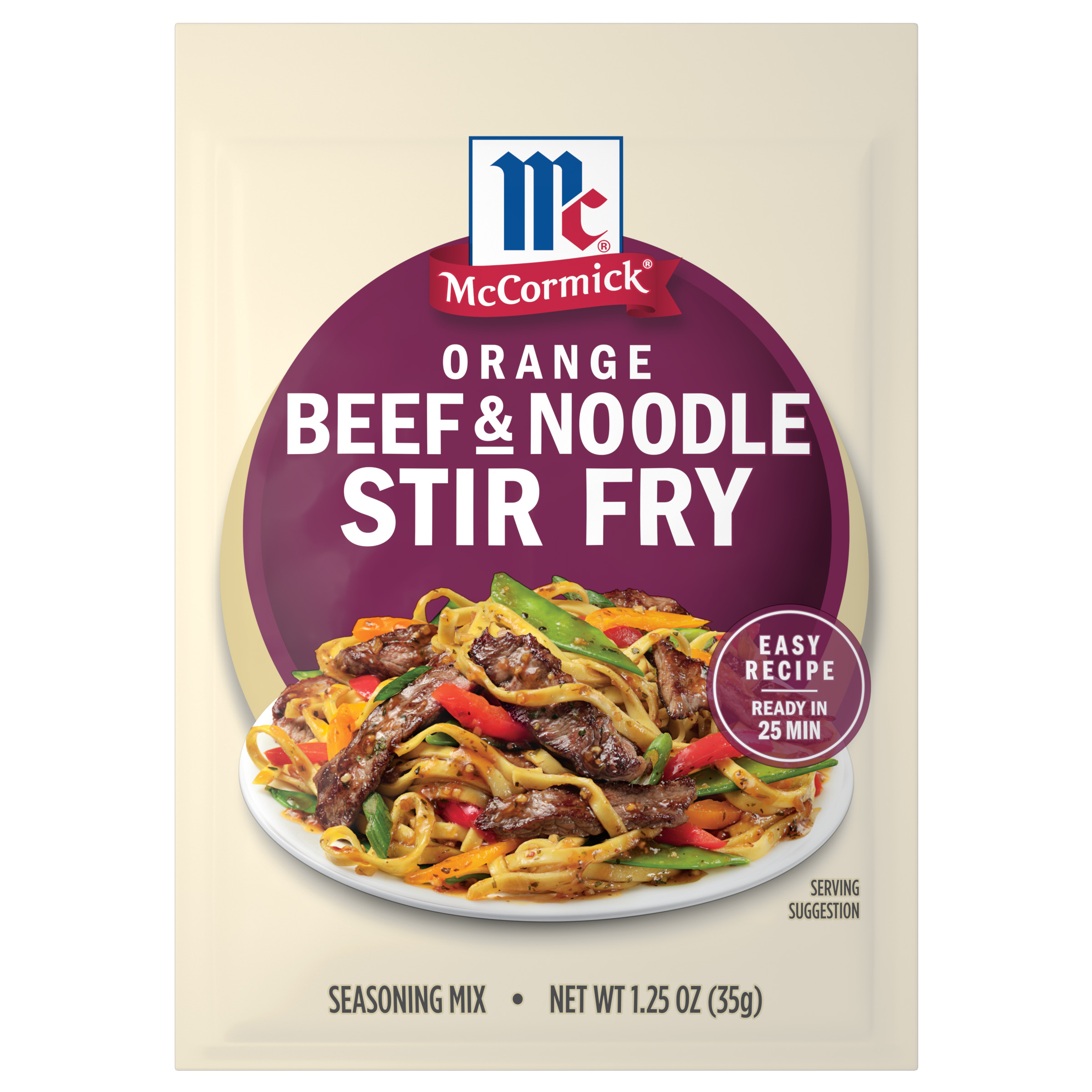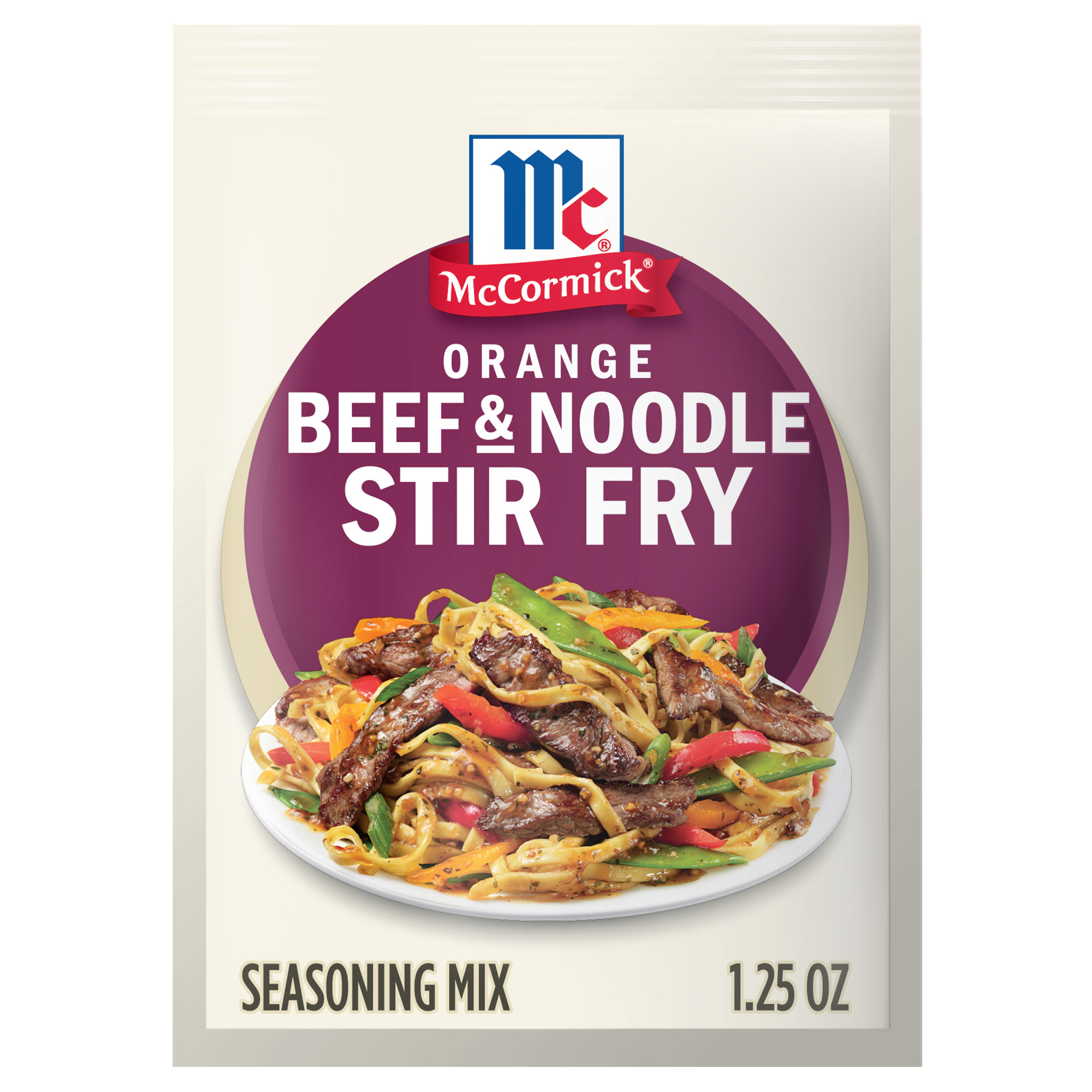 - What’s for dinner? McCormick® Orange Beef & Noodle Stir Fry Seasoning Mix helps you put together a complete meal that contains a protein, vegetable, and starch. In just 25 minutes, you can have a one-pan, Asian-inspired dinner on the table that’s perfect for weeknights.