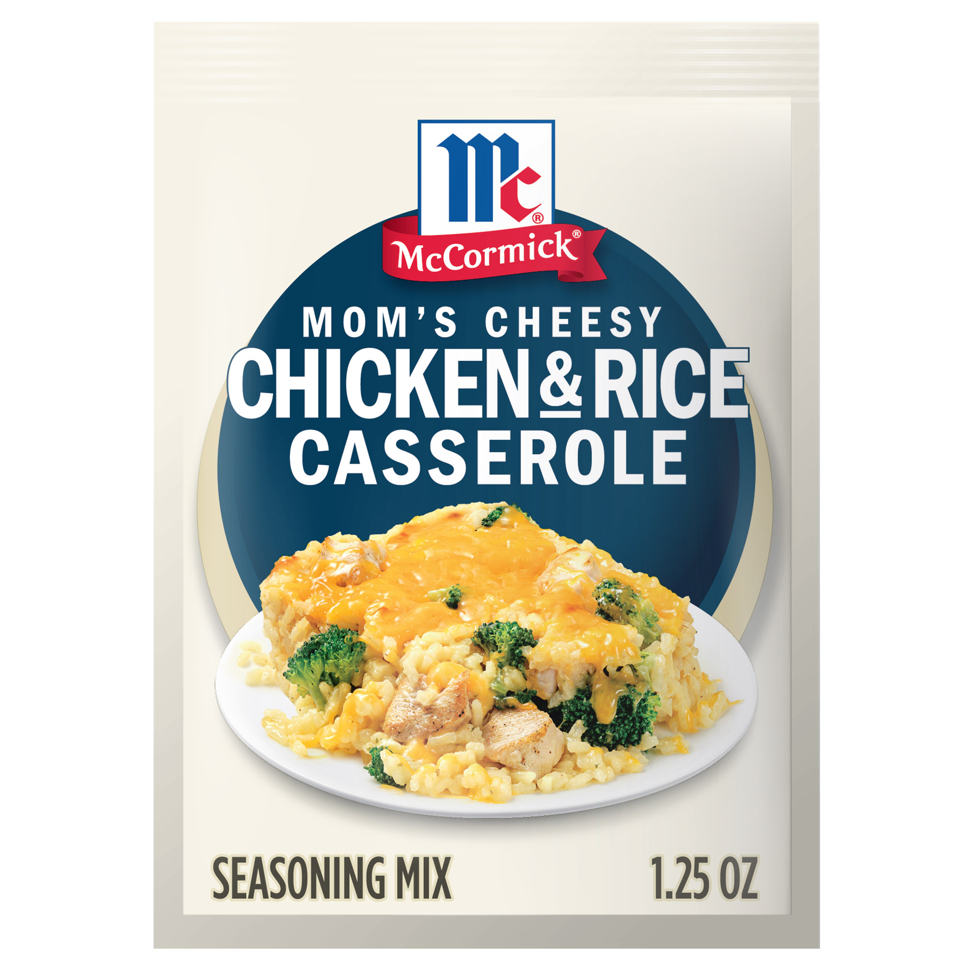 - Make weeknight dinners a breeze with McCormick® Mom’s Cheesy Chicken & Rice Casserole Seasoning Mix. This savory blend of garlic, onion, cheddar cheese, and other McCormick herbs and spices helps you whip up a dinner the whole family will love in just a little over an hour.