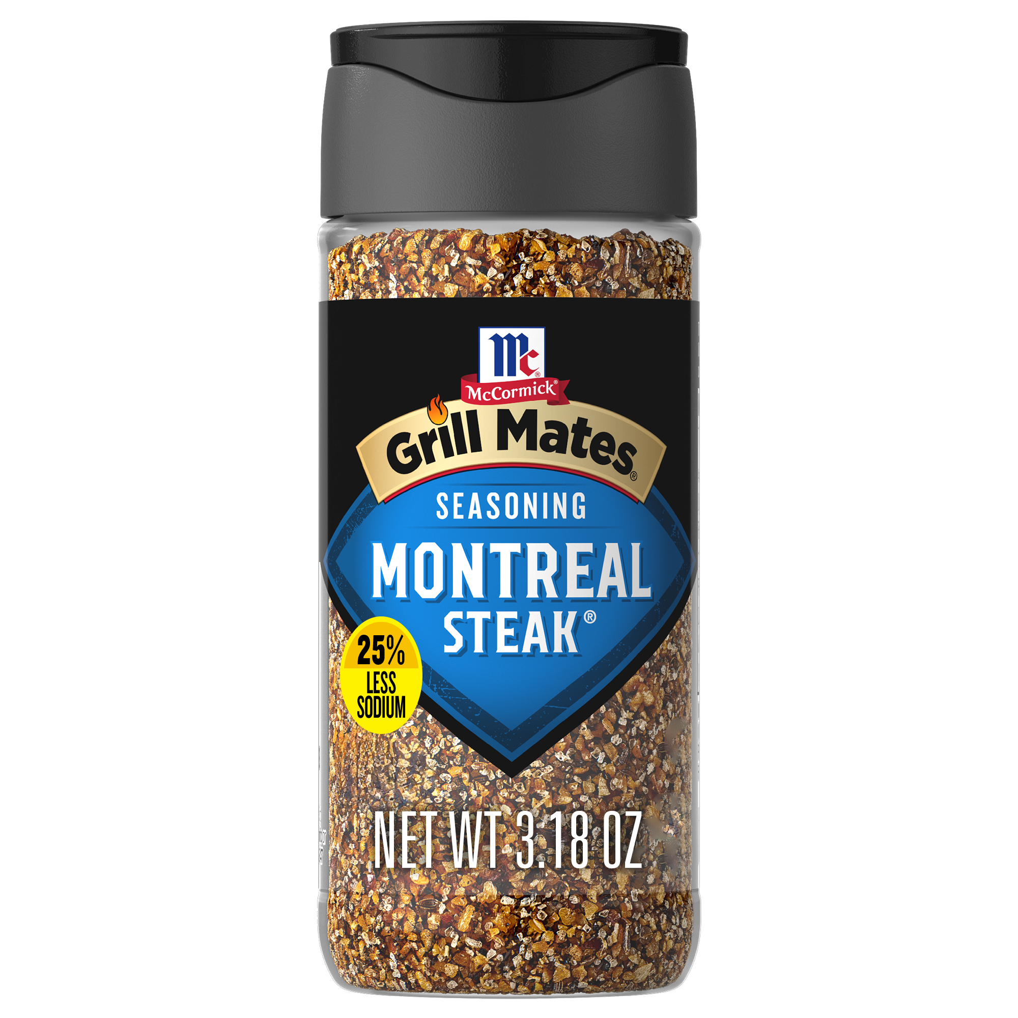 - Show them how it's done with a shake of McCormick Grill Mates 25% Less Sodium Montreal Steak Seasoning Blend. Made with McCormick Spices, including garlic, red and black pepper and paprika, this seasoning is your go-to source for steaks, pork and burgers that pack a flavor punch.