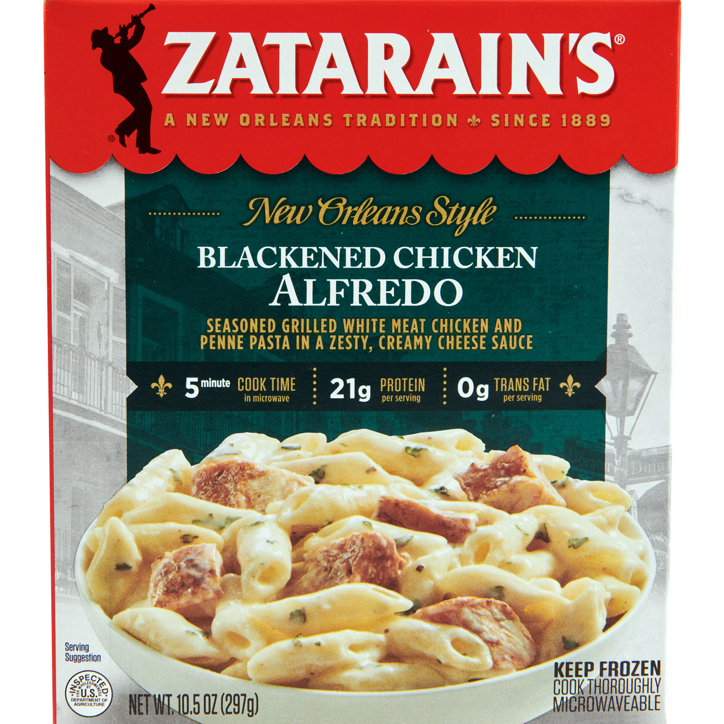 Extra Long Description Zatarain's Blackened Chicken Alfredo frozen dinner is big on flavor and microwave-ready in just 5 minutes. Enjoy this single-serve meal of chicken with blackened seasoning and penne pasta in a zesty, creamy cheese sauce any night of the week. Blackened Chicken Alfredo brings New Orleans-style flavor from the freezer to the table in minutes. Featuring penne pasta in a zesty, creamy cheese sauce with seasoned grilled white meat chicken, this dish puts a unique New Orleans twist on classic chicken alfredo. It's great to have on hand in your freezer for when you're in a bind for time. Just pop the frozen meal in the microwave for a jazzed up lunch or dinner. Keep frozen until ready to use. Do not refreeze. Refrigerate or discard leftovers. A New Orleans tradition since 1889, Zatarain's prides itself on great taste and a near fanatical dedication to New Orleans cuisine. We're heating up the frozen aisle with a variety of flavorful, New Orleans-inspired, convenient microwavable dinners for any night of the week. We offer multi-serve meals as well as individual meals. Look for the other great frozen flavors from Zatarain's, including Cajun-Style Chicken Carbonara, Shrimp Alfredo, Red Beans and Rice with Sausage, and Blackened Chicken with Yellow Rice. Or try our other products like rice sides, dinner mixes, pasta dinner mixes, breading, seasonings, seafood boils, spices, and condiments. Feature 1 NEW ORLEANS TWIST: Zatarain’s, a New Orleans tradition since 1889, brings you their twist on the classic chicken alfredo dinner with a frozen pasta meal. Feature 2 FLAVORFUL CHICKEN AND PASTA: Features blackened chicken and penne pasta in a zesty, creamy cheese sauce. The grilled white meat chicken is seasoned just right with blackened seasoning. Feature 3 SINGLE-SERVE: Convenient single-serve frozen chicken and pasta dinner for any night of the week; comes in its own bowl so no cleanup is minimal. Feature 4 MICROWAVE OR OVEN: Frozen meal can be cooked in the microwave or oven. Microwave cook time is just 5 minutes. Feature 5 MORE ZATARAIN’S: Zatarain’s bring the bold flavor of New Orleans to your table with frozen dinners, rice sides, and dinner mixes, pasta dinner mixes, breading, seasonings, seafood boils, spices, and condiments. Preparation Instructions Microwave directions to prepare Zatarain’s Blackened Chicken Alfredo Frozen Dinner: Microwave ovens vary; cooking times may need to be adjusted. Cooking times are based on a 1100 watt microwave oven. 1. REMOVE BOWL from outer carton. Cut slit in center of film cover. 2. MICROWAVE ON HIGH 3 minutes. Carefully peel back film; stir. Replace film. Microwave on HIGH for additional 1 to 2 minutes or until cooked through. 3. LET STAND in microwave 1 minute. Carefully remove bowl from microwave. Remove film cover. Stir before serving. OVEN DIRECTIONS: Do not heat under broiler or in toaster oven. 1. PREHEAT OVEN to 350ºF. Remove bowl from outer carton. Cut a slit in center of film cover. 2. PLACE BOWL on baking sheet in center of oven. Bake 35 minutes. 3. CAREFULLY REMOVE FROM OVEN. Let stand 1 minute. Remove film cover. Stir before serving. Storage Instructions Keep Zatarain’s Blackened Chicken Alfredo Frozen Dinner frozen until ready to use. Do not refreeze. Refrigerate or discard leftovers. Store this shelf-stable item at a freezing temperature. Shelf life: 540 days. Universal Allergens Contains: Milk and Dairy, Soy, Wheat Benefits No High Fructose Product Nutritional Claims NONE Nutrient Content Claims No Artificial Flavors 10 digit UPC 7142900246 12 digit UPC 071429002463 GTIN 00071429002463 Serving Size 297 Serving Size Unit of Measure g Servings per Container 1 Height 5.754 Depth 1.786 Width 6.76