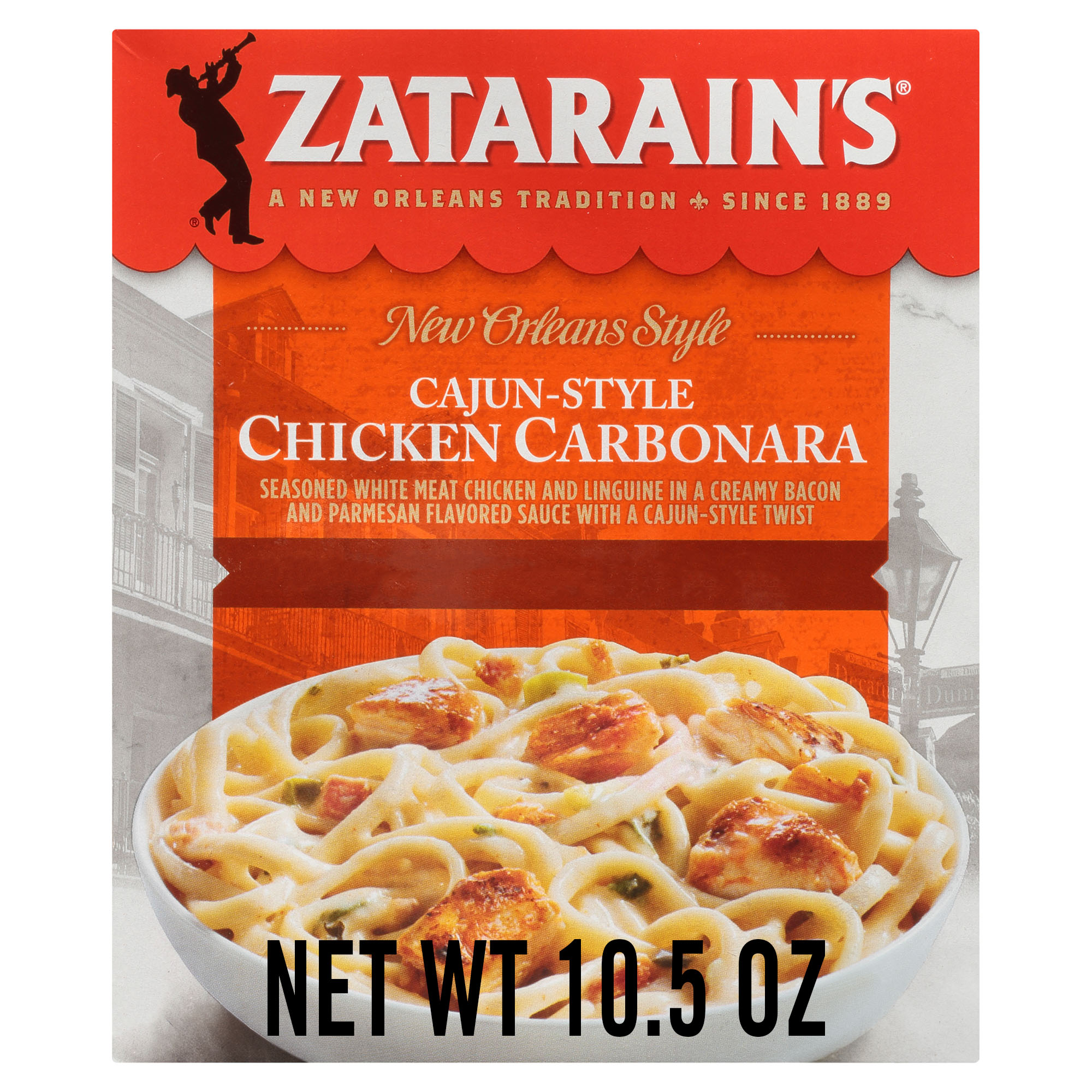 - Zatarain's jazzes up the classic carbonara pasta with a frozen pasta meal that goes from the freezer to the table in minutes. Enjoy Zatarain's Frozen Cajun-Style Chicken Carbonara - seasoned white meat chicken and linguine in a creamy bacon and Parmesan flavored sauce with a Cajun-style twist - for dinner tonight!