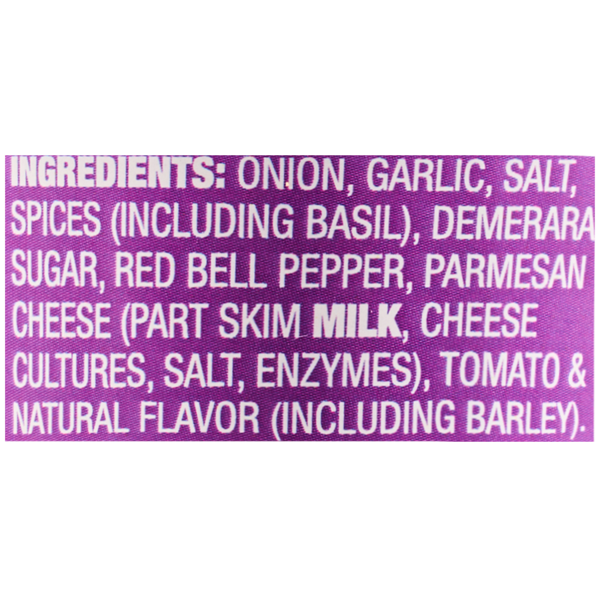 | ingredients | ONION, GARLIC, SALT, SPICES (INCLUDING BASIL), DEMERARA SUGAR, RED BELL PEPPER, PARMESAN CHEESE (PART SKIM MILK, CHEESE CULTURES, SALT, ENZYMES), TOMATO & NATURAL FLAVOR (INCLUDING BARLEY). |