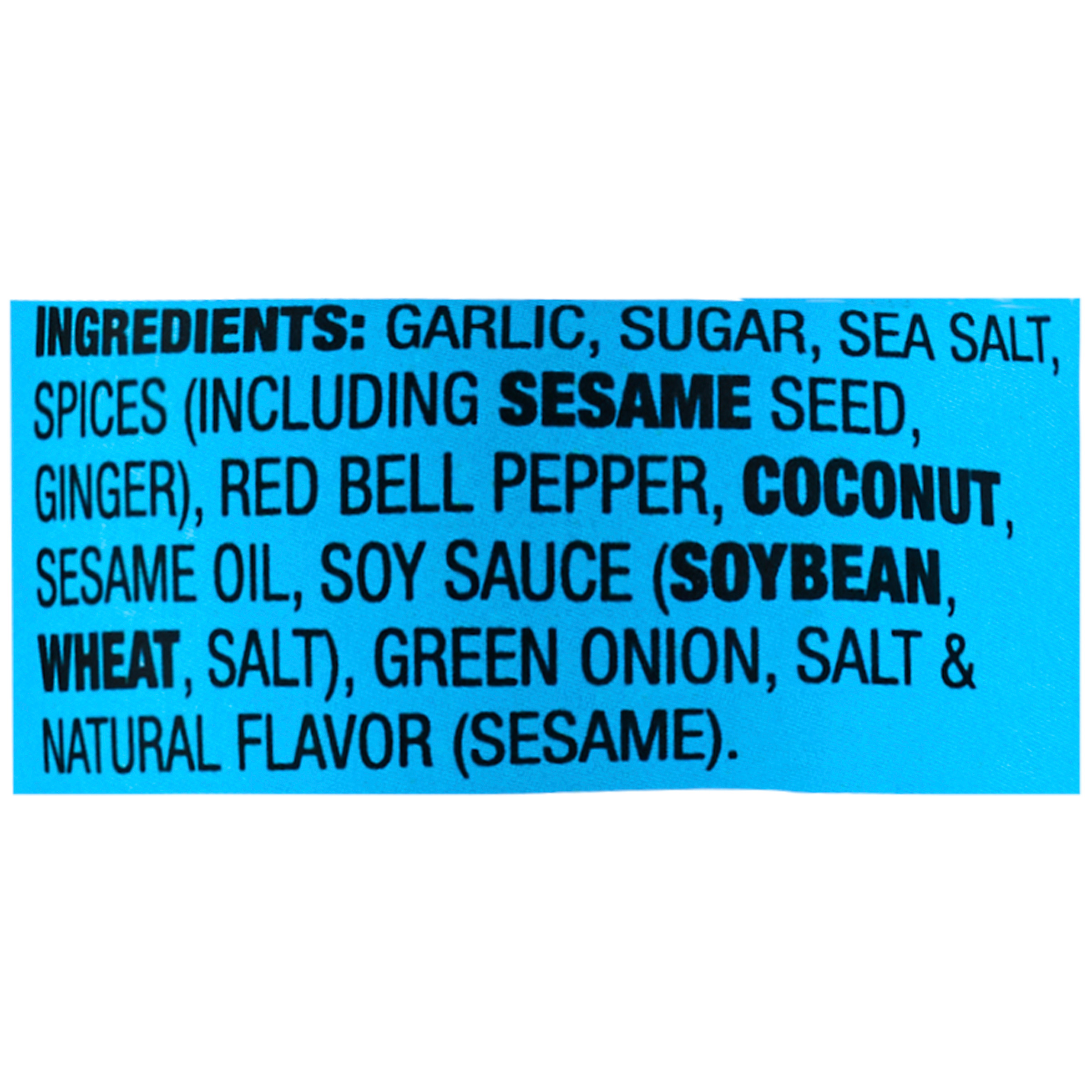 | ingredients | GARLIC, SUGAR, SEA SALT, SPICES (INCLUDING SESAME SEED, GINGER), RED BELL PEPPER, COCONUT, SESAME OIL, SOY SAUCE (SOYBEAN, WHEAT, SALT), GREEN ONION, SALT & NATURAL FLAVOR (SESAME). |