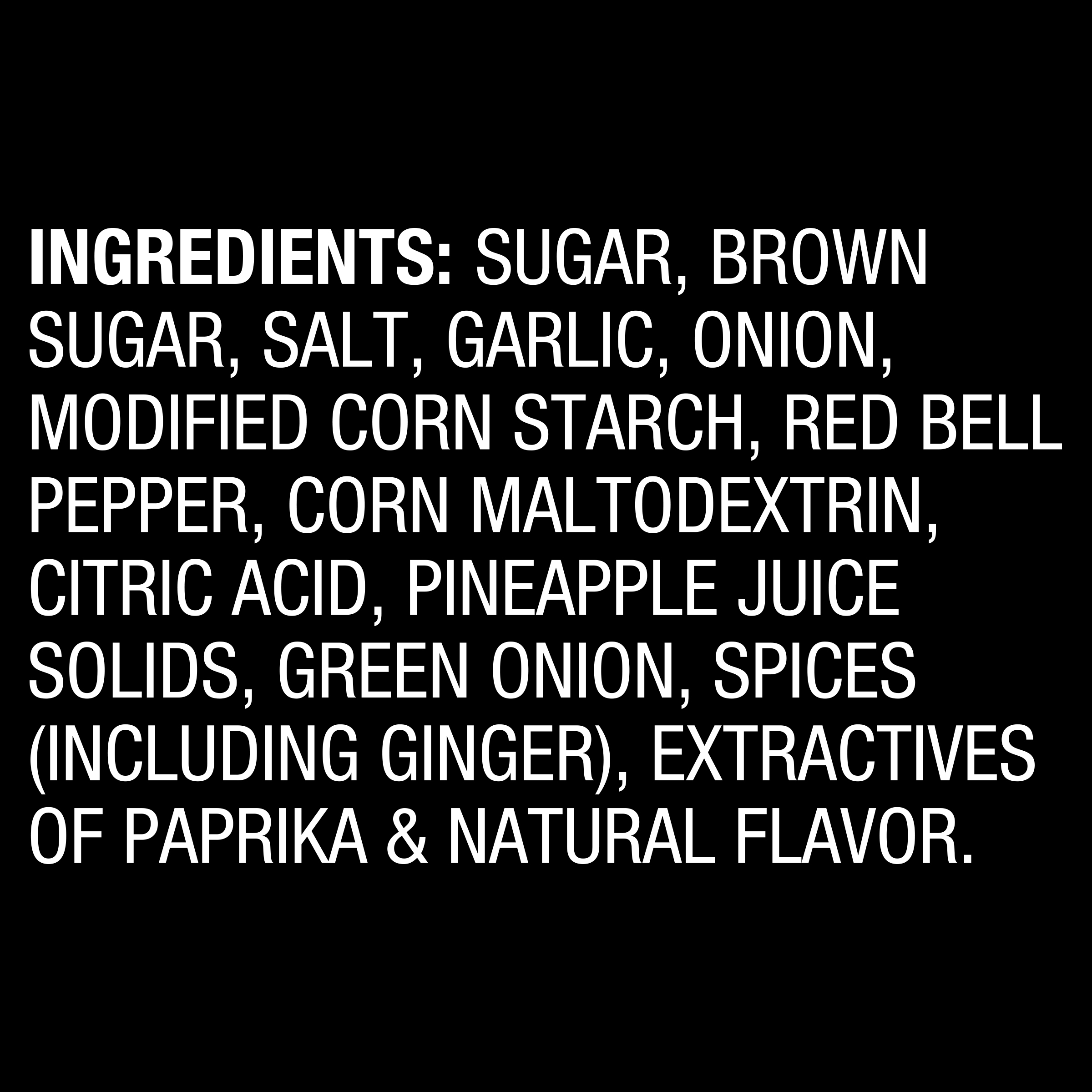 | ingredients | SUGAR, BROWN SUGAR, SALT, GARLIC, ONION, MODIFIED CORN STARCH, RED BELL PEPPER, CORN MALTODEXTRIN, CITRIC ACID, PINEAPPLE JUICE SOLIDS, GREEN ONION, SPICES (INCLUDING GINGER), EXTRACTIVES OF PAPRIKA & NATURAL FLAVOR. |