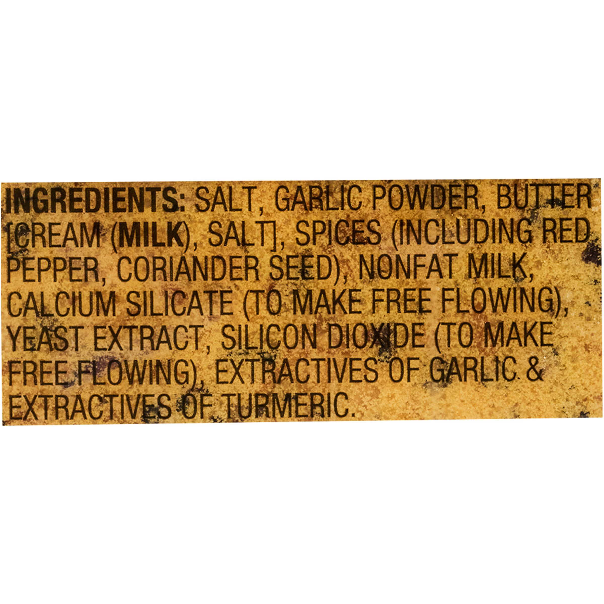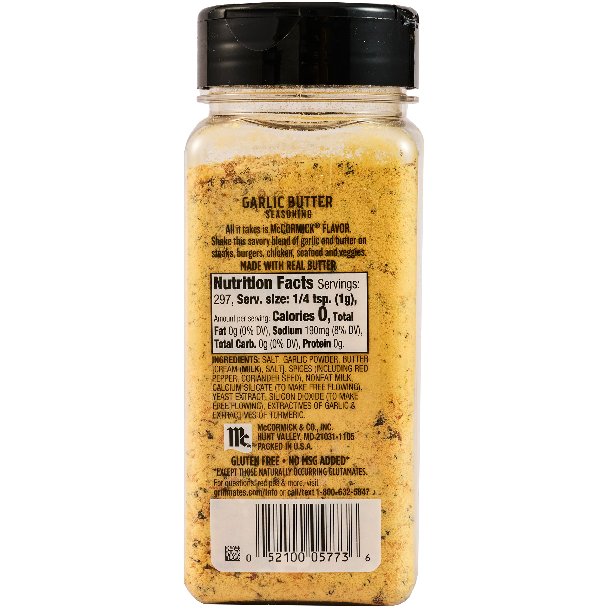 X12digit.UPC 052100057736 Computed Product Name Garlic Butter Grill Seasoning Paleo no ingredients Salt, Garlic Powder, Butter (Cream (Milk)), Salt, Spices (Including Red Pepper, Coriander Seed), Nonfat Milk, Calcium Silicate (To Make Free Flowing), Yeast Extract, Silicon Dioxide (To Make Free Flowing), Extractives of Garlic & Extractives of Turmeric.