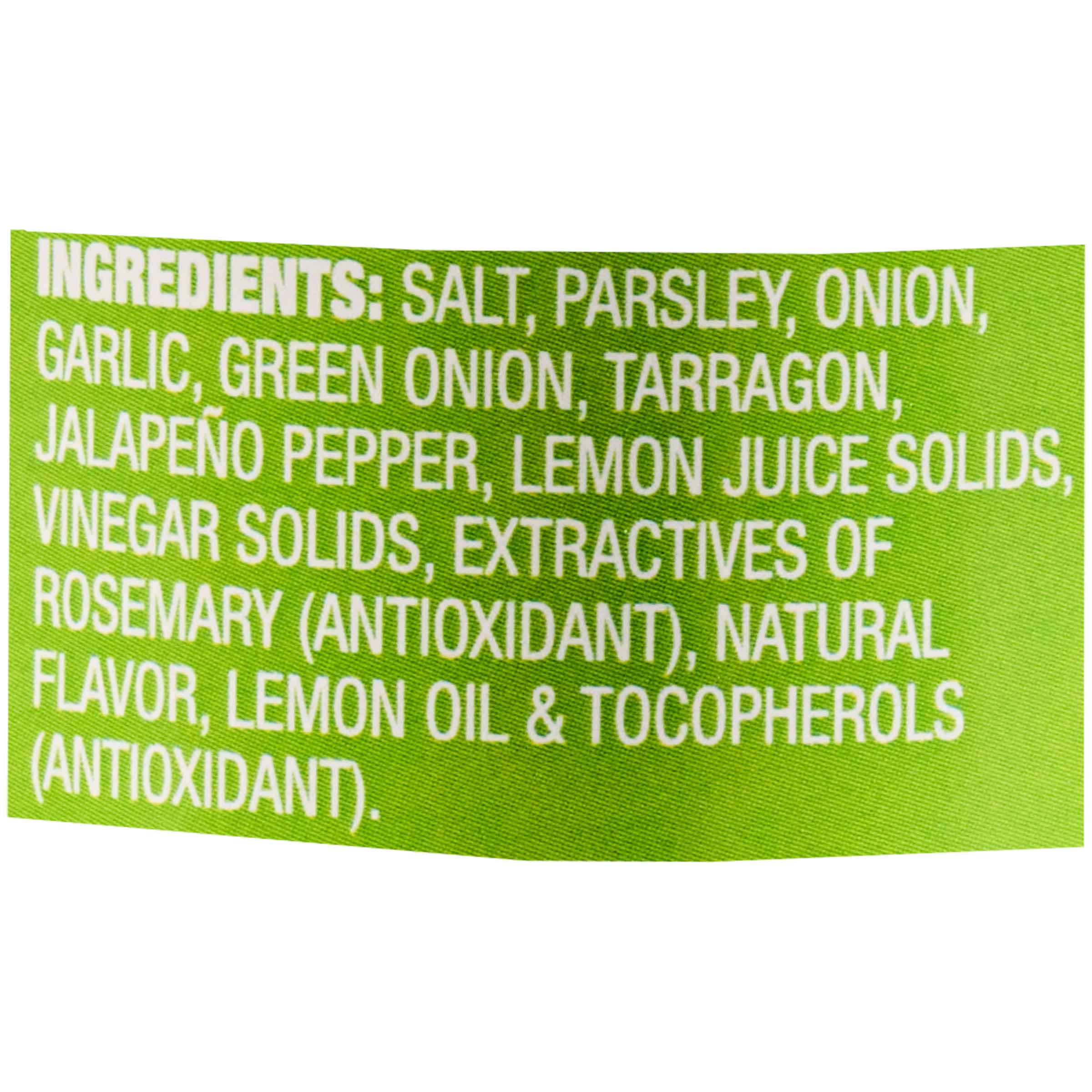 | ingredients | SALT, PARSLEY, ONION, GARLIC, GREEN ONION, TARRAGON, JALAPEÑO PEPPER, LEMON JUICE SOLIDS, VINEGAR SOLIDS, EXTRACTIVES OF ROSEMARY (ANTIOXIDANT), NATURAL FLAVOR, LEMON OIL & TOCOPHEROLS (ANTIOXIDANT). |