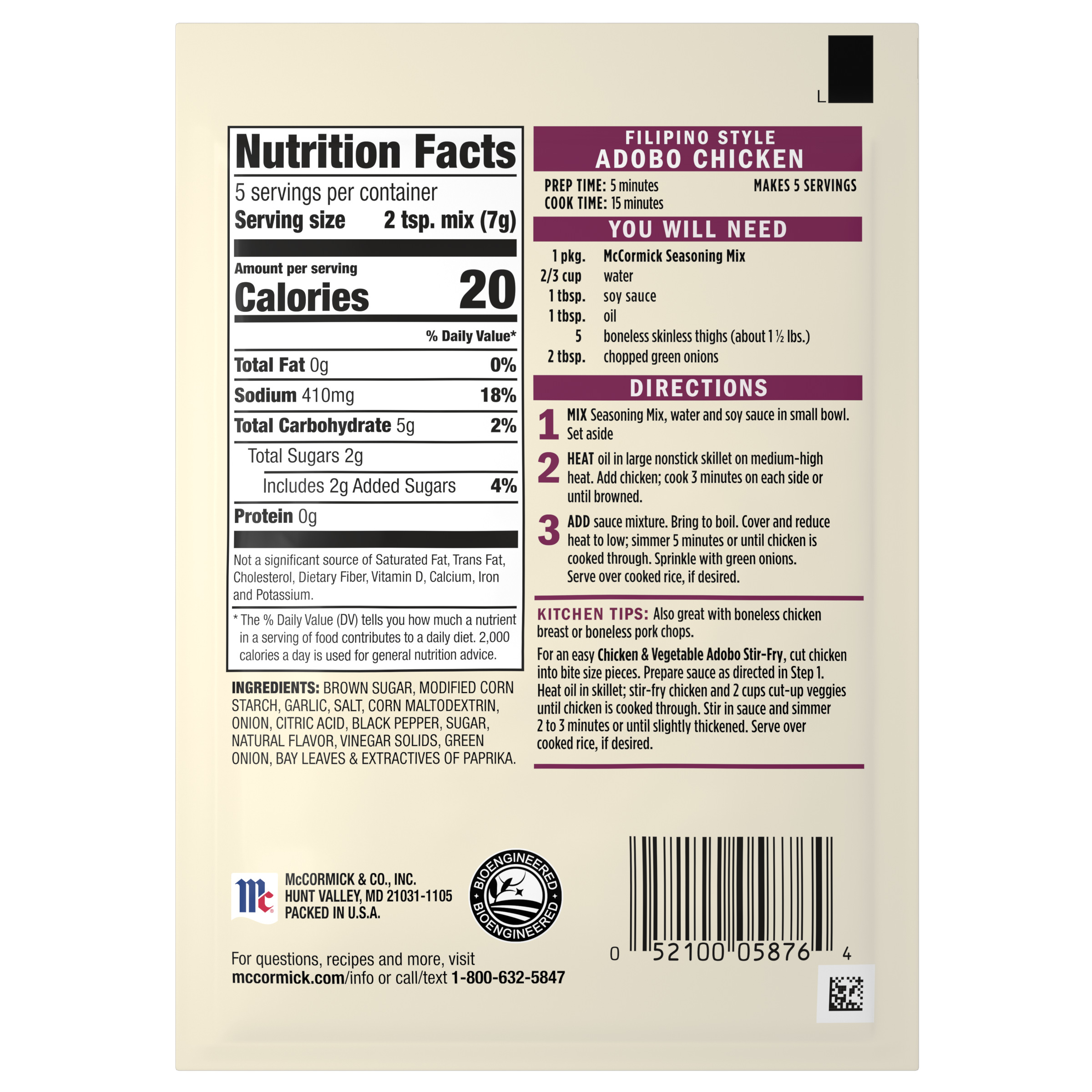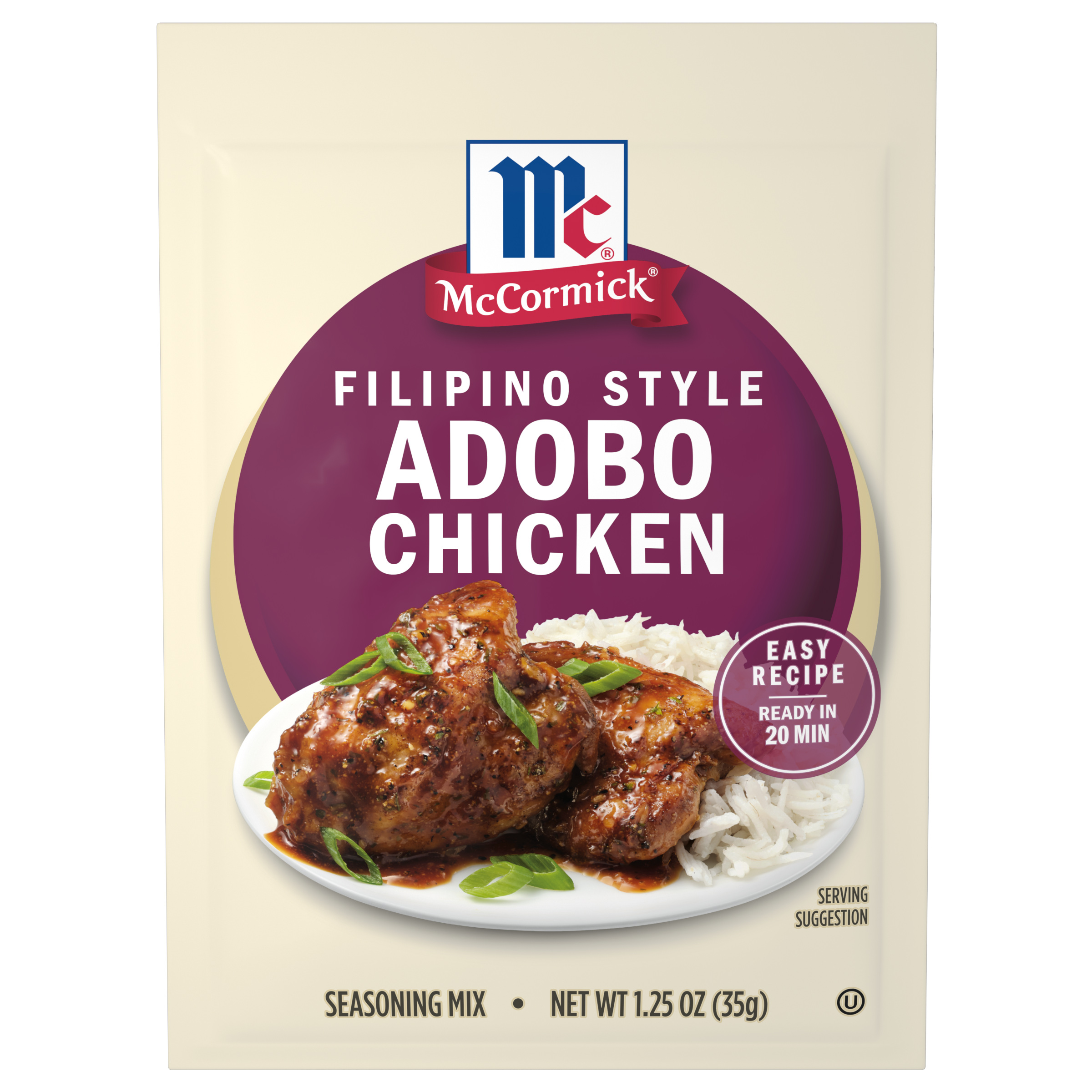 | Extra Long Description | Discover a quick and easy take on the popular Philippines – Adobo Chicken. Coated with a savory, sweet, and tangy sauce and served over rice, this delicious chicken recipe comes together in just 20 minutes with McCormick® Filipino Style Adobo Chicken Seasoning Mix. Adobo chicken gets its signature flavor from simmering in soy sauce, white vinegar, brown sugar, and aromatics like onion, garlic, and bay leaves. To prepare our easy recipe, brown chicken thighs, add seasoning mix, water and soy sauce, and simmer until chicken is cooked through. Serve over a bed of rice. McCormick brings a wide variety of flavor and cuisine you crave to your table with our delicious and convenient seasoning mixes. From comfort food favorites like meatloaf and chili to globally inspired dishes like Filipino Style Adobo Chicken or Beef & Broccoli, we’ve got flavor covered. |