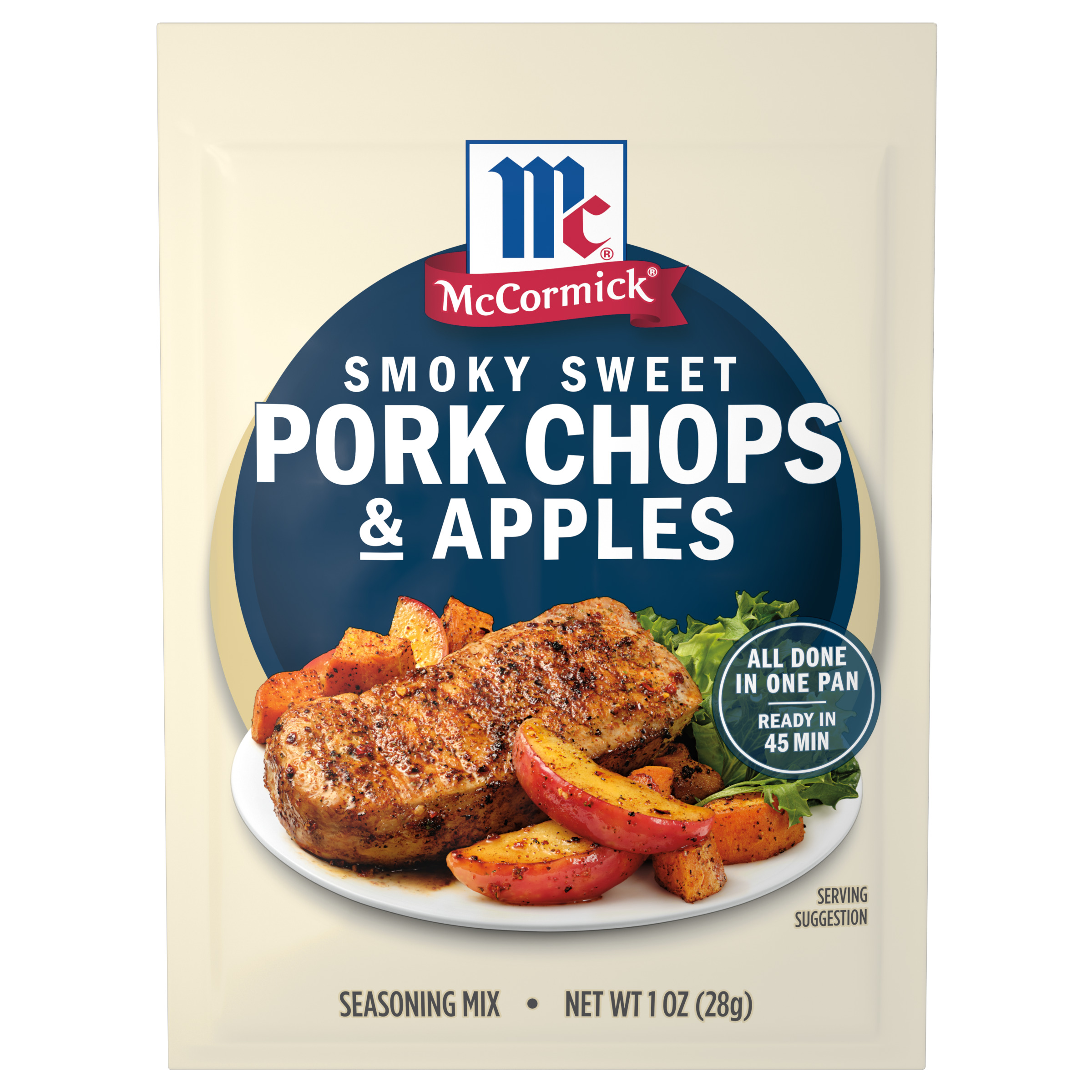 | Extra Long Description | Make weeknight dinners a breeze with McCormick® Smoky Sweet Pork Chops & Apples Seasoning Mix. This savory-meets-sweet blend of paprika, brown sugar, onion, garlic, and hickory smoke helps you whip up a pork chop dinner the whole family will love in just 45 minutes. What’s for dinner? McCormick Smoky Sweet Pork Chops & Apples Seasoning Mix has the answer. Simply add your favorite protein — think pork chops, chicken thighs, or even turkey cutlets. Then round out the plate with tart apples and sweet potatoes, red potatoes, or butternut squash for a hearty meal. Welcome to the world of McCormick spices. From sweet to savory to spicy and more, we have all the flavors you need to get inspired in the kitchen. With our wide variety of ingredients to explore, your next favorite spice is always just around the corner. |