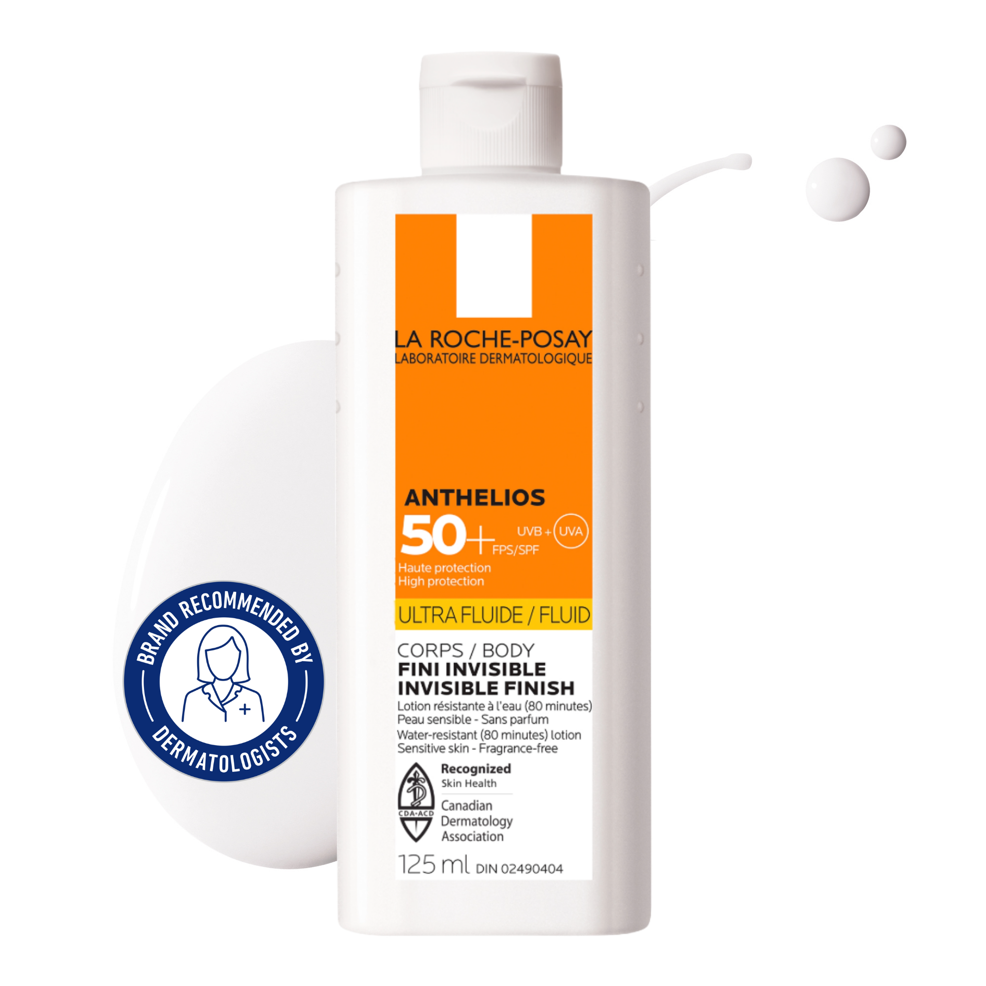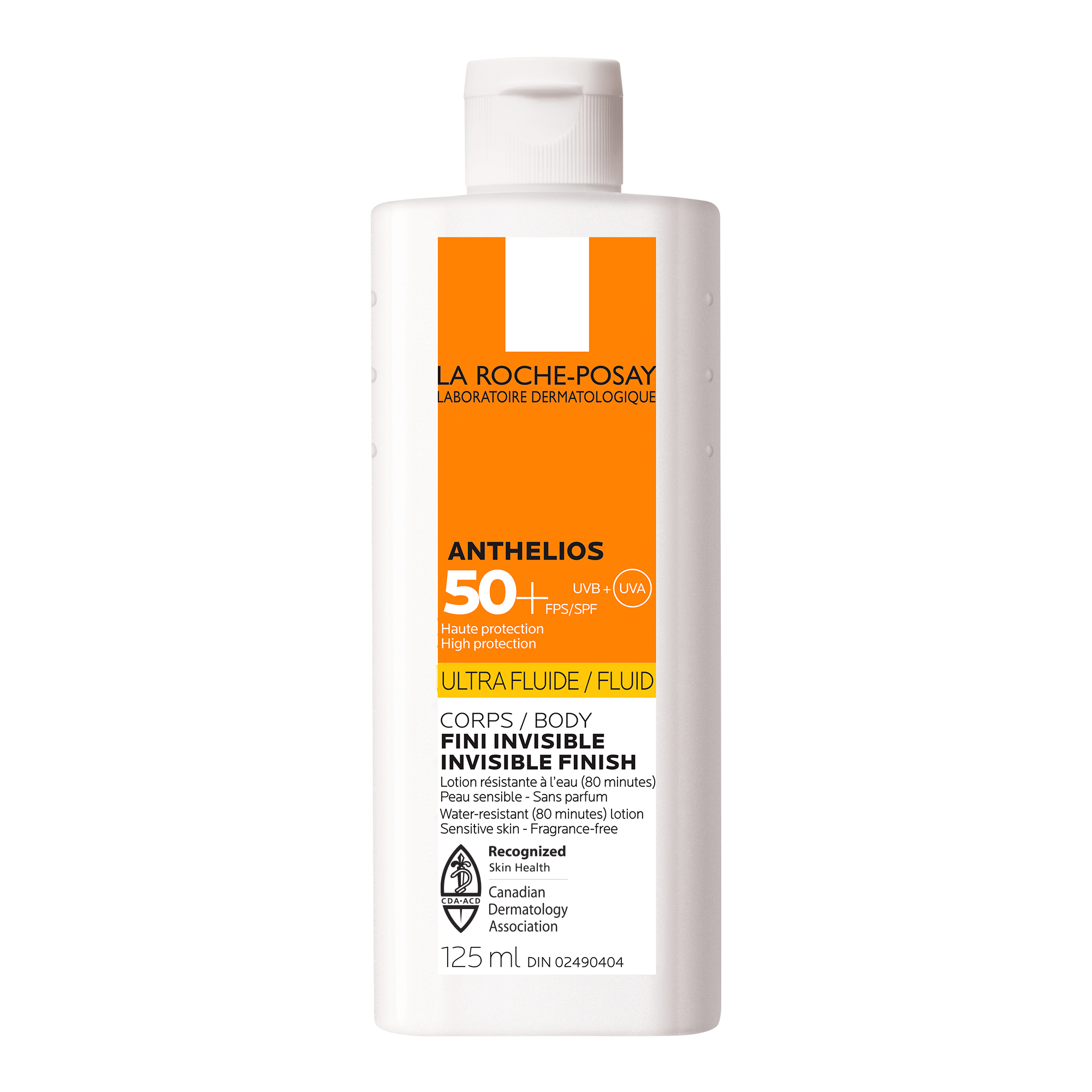 Walmart product name La Roche-Posay Anthelios Ultra Fluid SPF 50+, Lightweight Body Sunscreen for Sensitive Skin, 125mL Walmart Product Description Short Protect your body with this ultra-light, oil-free sunscreen offering broad-spectrum SPF 50+ defense. Formulated for all skin types, including sensitive skin, it addresses concerns of sun damage and premature aging. The fast-absorbing, non-greasy lotion quickly penetrates the skin, leaving a completely invisible finish without a white cast. Dermatologist-tested for optimal safety, it provides reliable, water-resistant protection against environmental aggressors during outdoor activities. walmart_consumer_benefit - Ultra-light body sunscreen: Delivers high broad-spectrum SPF 50+ protection to shield the body from harmful UVA and UVB rays effectively