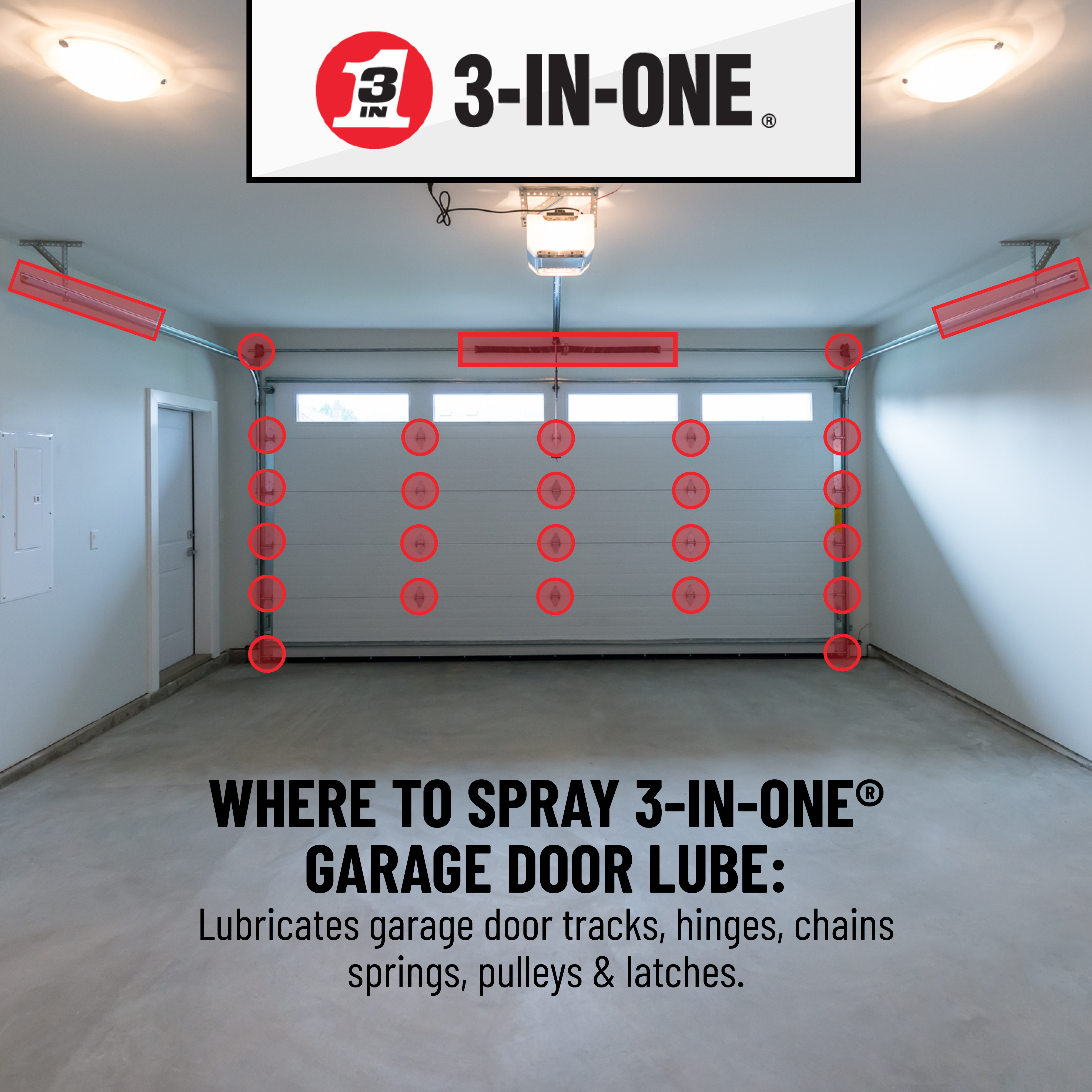 | Long Description - Farm | 3-IN-ONE 11 oz. Garage Door Lube is a clear silicone spray that lubricates, protects, and prevents sticking on hinges, tracks, chains, and pulleys. Its low-buildup formula reduces friction and minimizes wear on garage door components. |