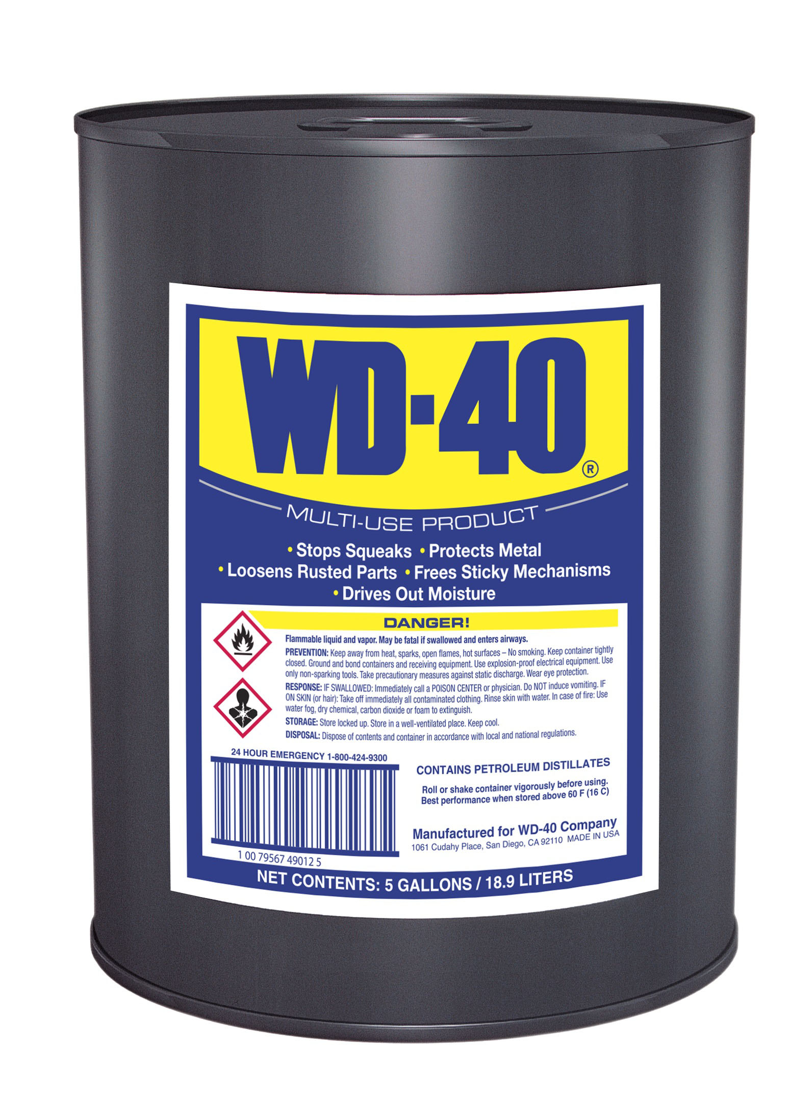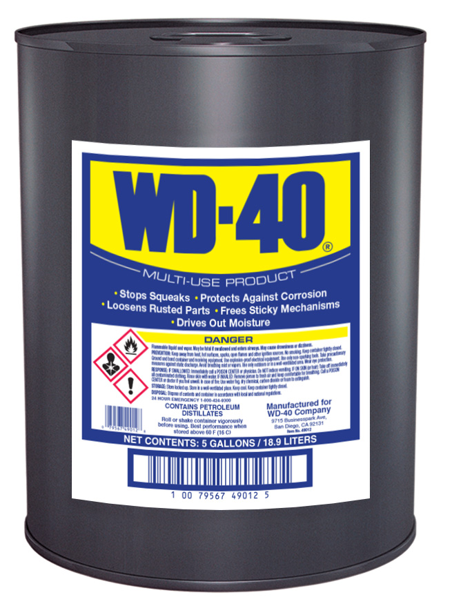 Product Title - Farm WD-40® Multi-Use Product 5 Gallon, Bulk Penetrating Lubricant for Farm Equipment & Tools Long Description - Farm The WD-40 Multi-Use Product 5 Gallon is built for high-volume garage and shop use and supports soaking or dipping equipment parts, machinery, and tools. It penetrates rust, lubricates moving components, displaces moisture, and protects metal from corrosion. Expanded Features - Farm - IDEAL FOR SOAKING & DIPPING: 55-gallon drum supports large-scale soaking and dipping of equipment and vehicle parts, tools, and hardware for deep penetration and protection.