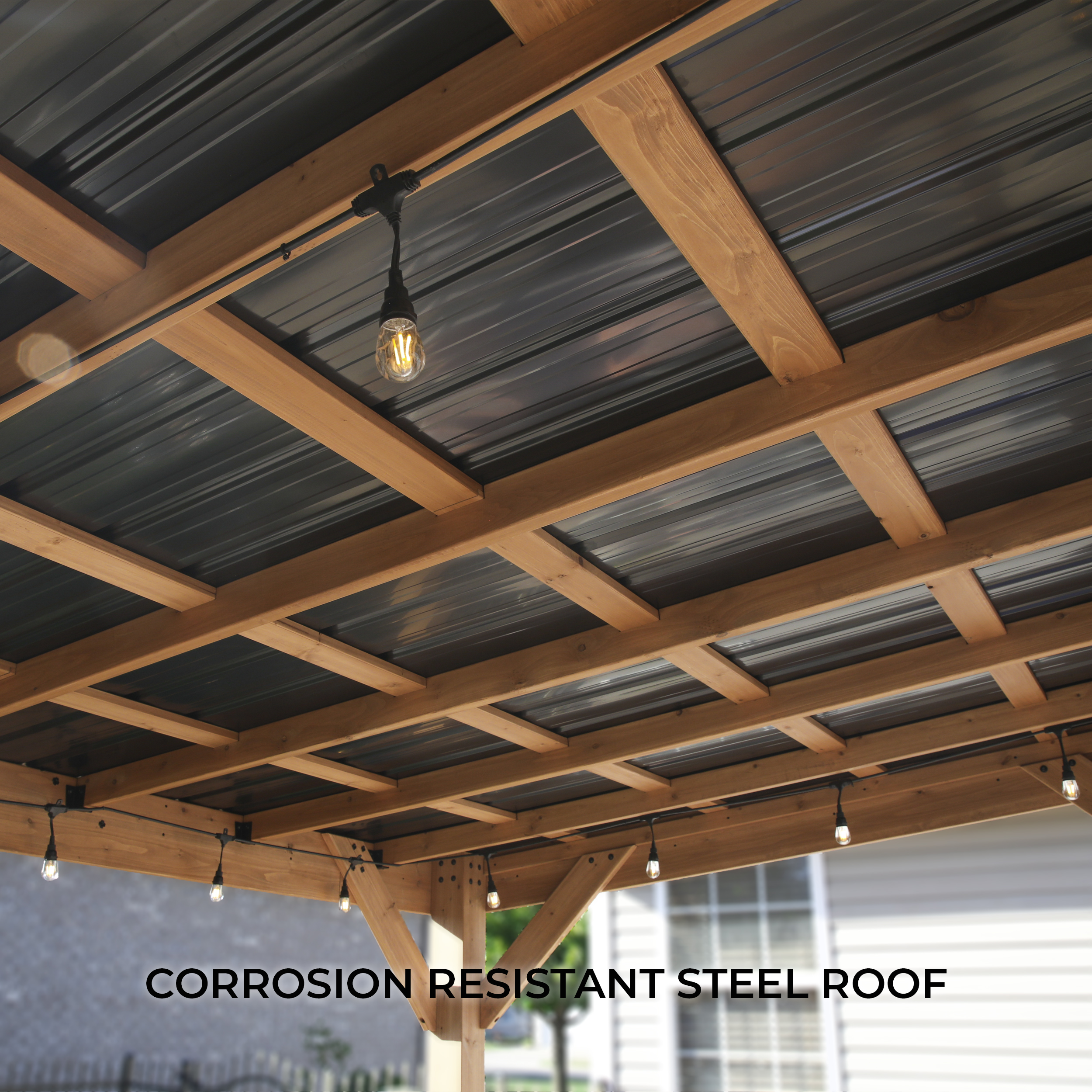 - Heavy-Duty Steel Roof: 29-gauge black steel roof provides dent and corrosion resistance