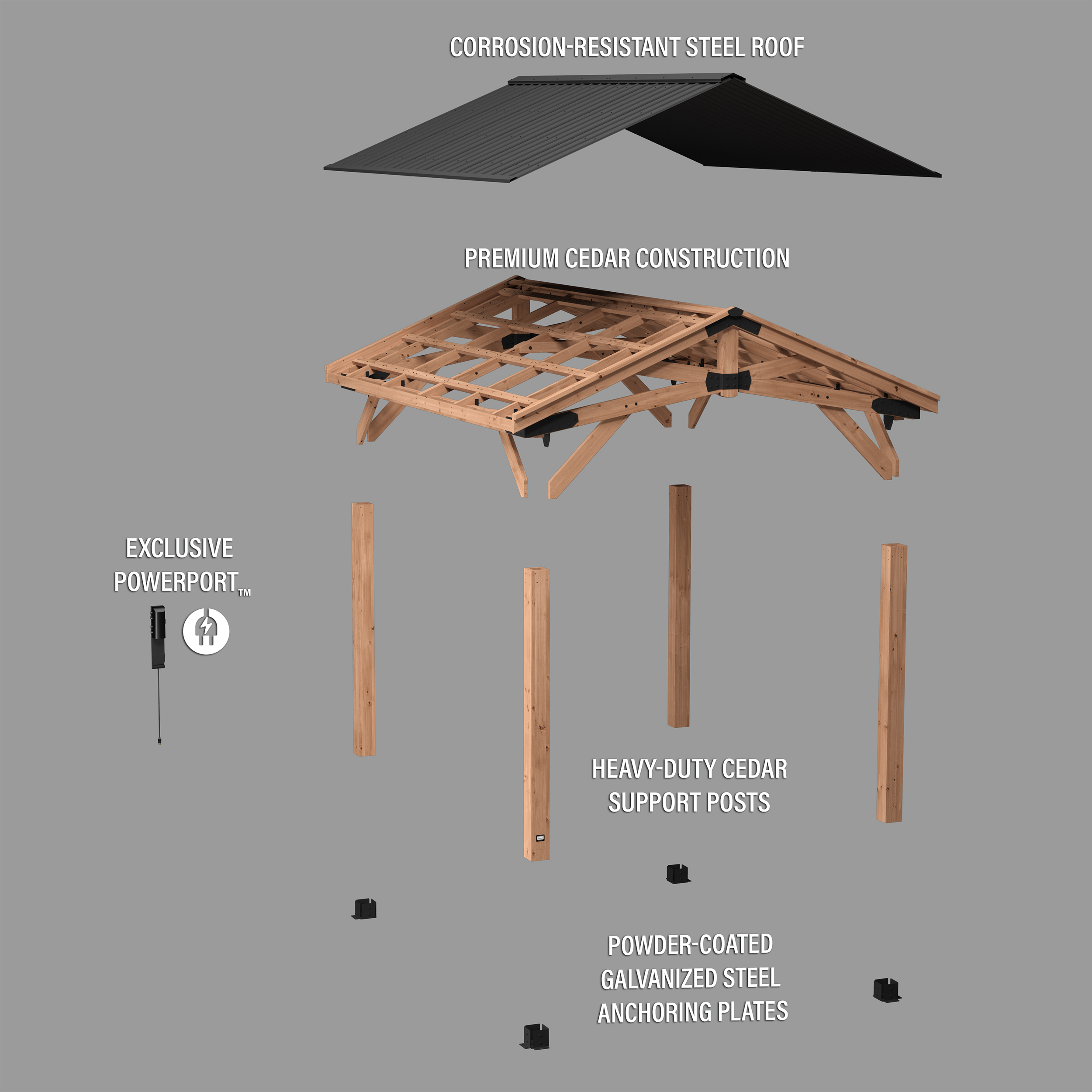 - Powered Up: Patented PowerPort™ features 3 electrical outlets and 3 USB ports to power your outdoor living space, mounting easily to any post on the structure (power source not included)