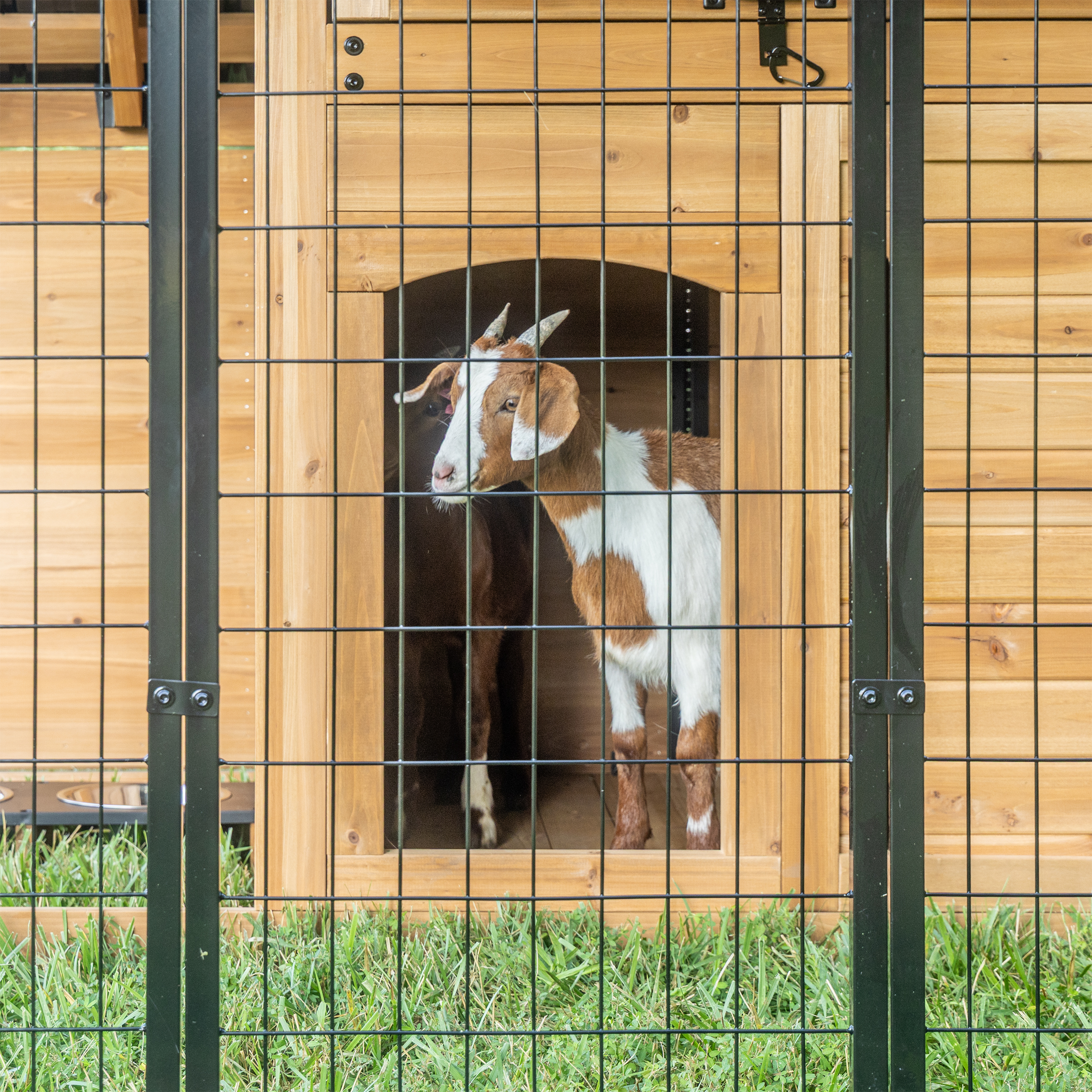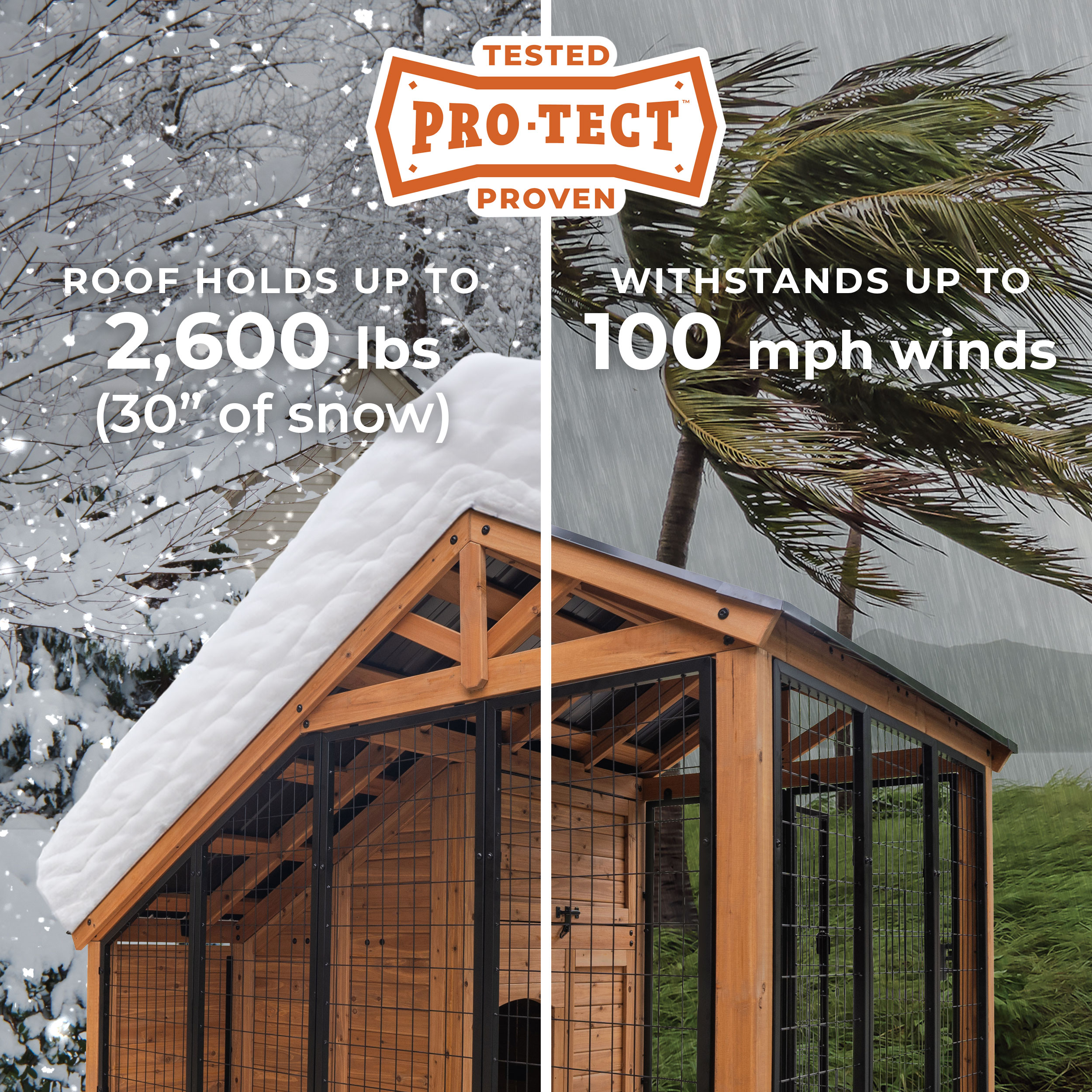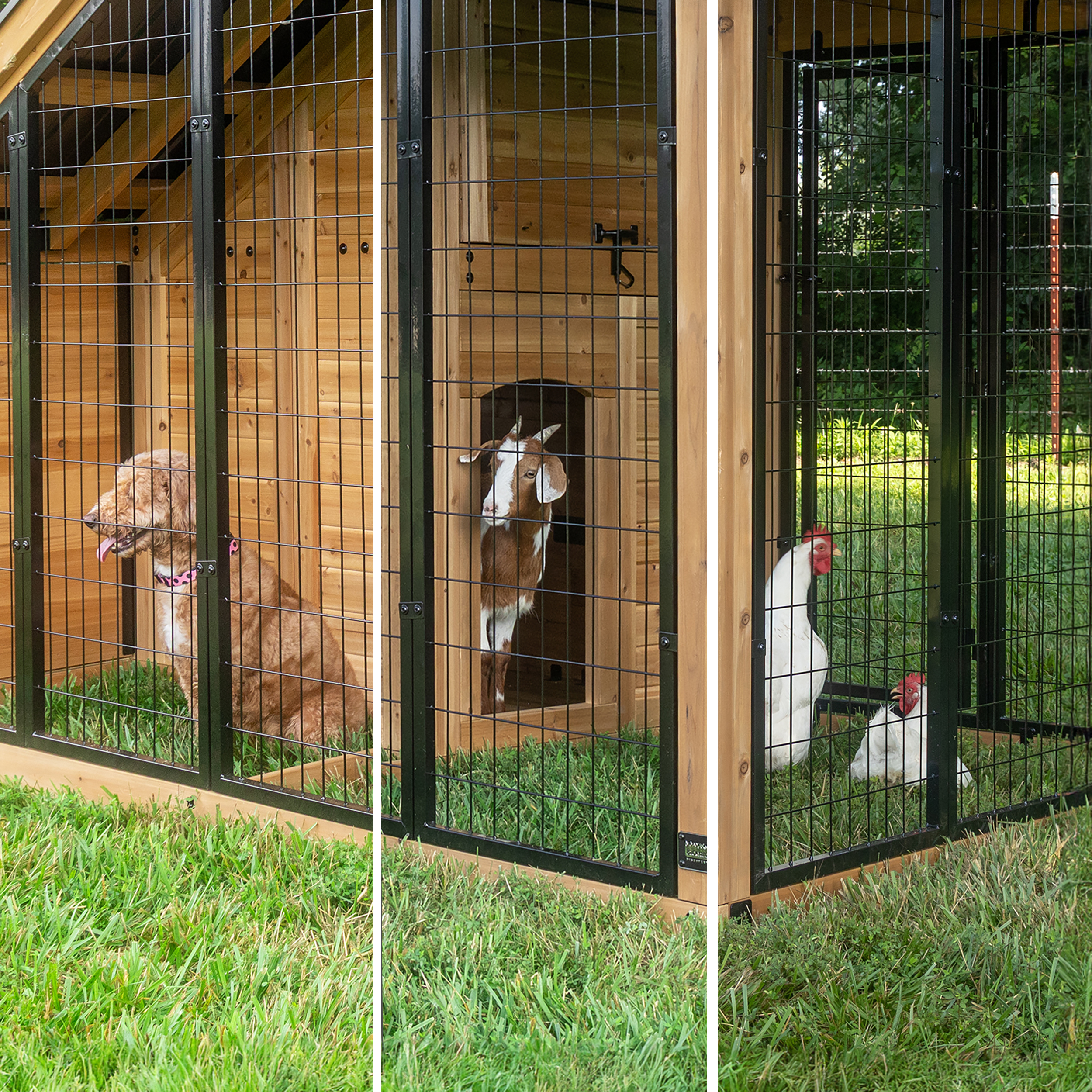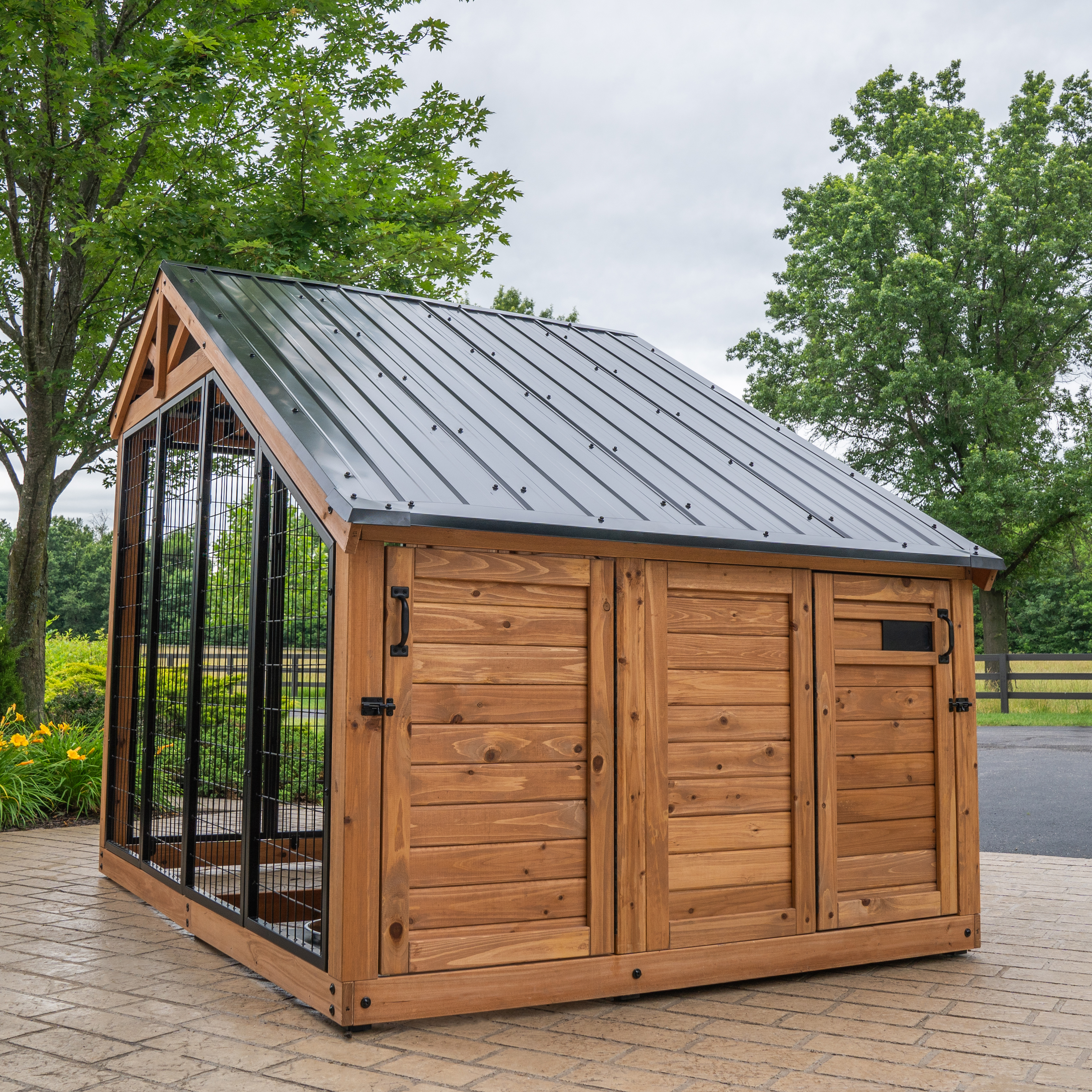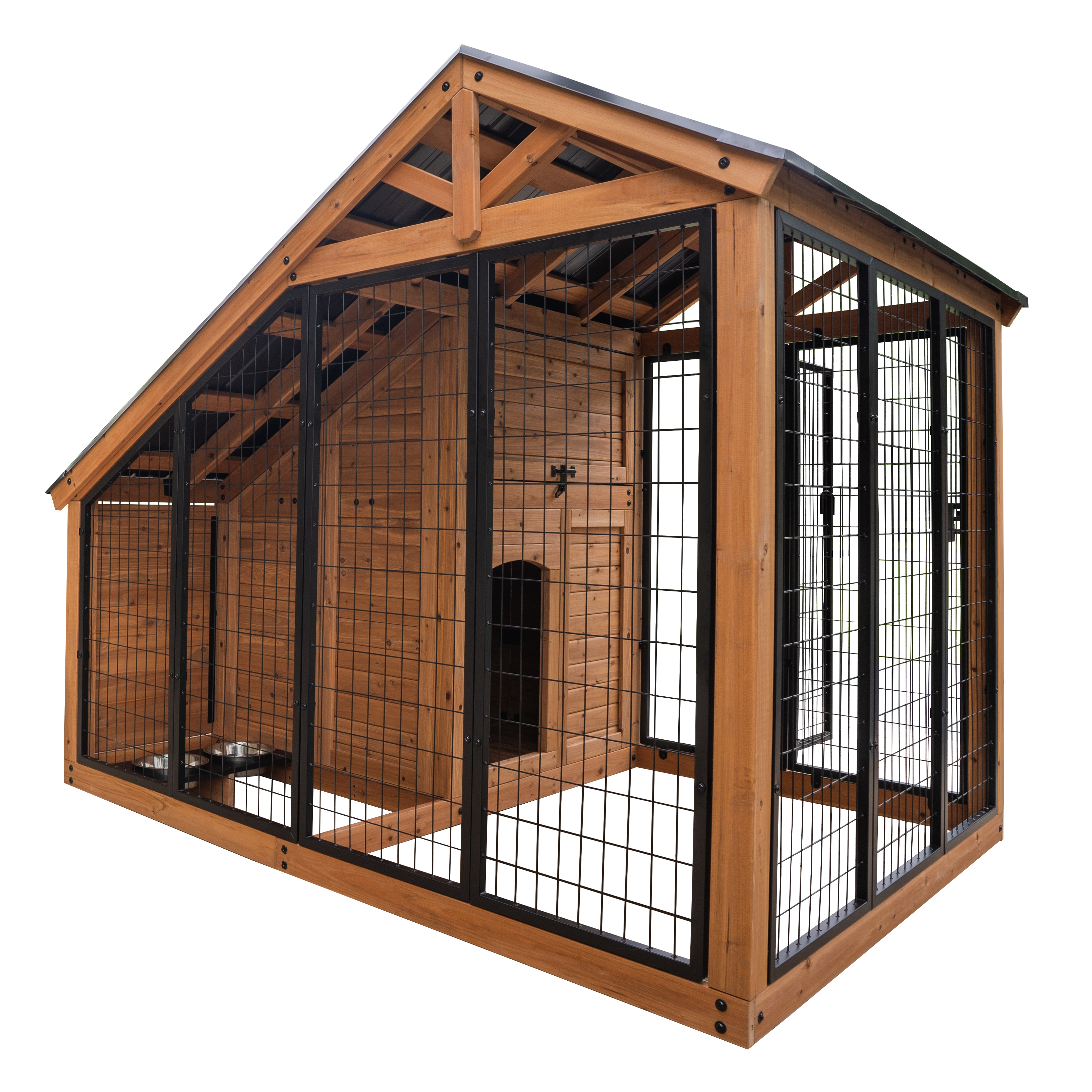 | Amazon Long Description | Give your furry friends the ultimate outdoor oasis with Backyard Discovery’s Waggin’ Retreat Dog Kennel. Designed with comfort and convenience in mind, this stylish pet condo goes beyond a typical dog crate by providing your pets with a haven during outdoor time or a cozy space that's all their own while guests are visiting. Crafted from beautiful cedar wood and a 29-gauge galvanized steel roof, this large doghouse not only creates a safe outdoor shelter to protect your pets from the elements but also offers long-lasting durability. The customizable gate features seven different placement options, allowing for versatile assembly to perfectly suit your space and preferences. Its spacious design offers pets plenty of room to roam and relax, while keeping them safe from outdoor critters. Complete with a built-in storage area, this charming pet kennel provides a convenient solution for organizing food, toys, and supplies. An easy-access feeding door allows you to refill water and food bowls effortlessly, while the doghouse back door enhances accessibility and simplifies cleaning to ensure maintenance is a breeze. This outdoor pet house not only enhances your backyard's style but also provides a comfortable and cozy retreat for your beloved pets to enjoy the outdoors. |