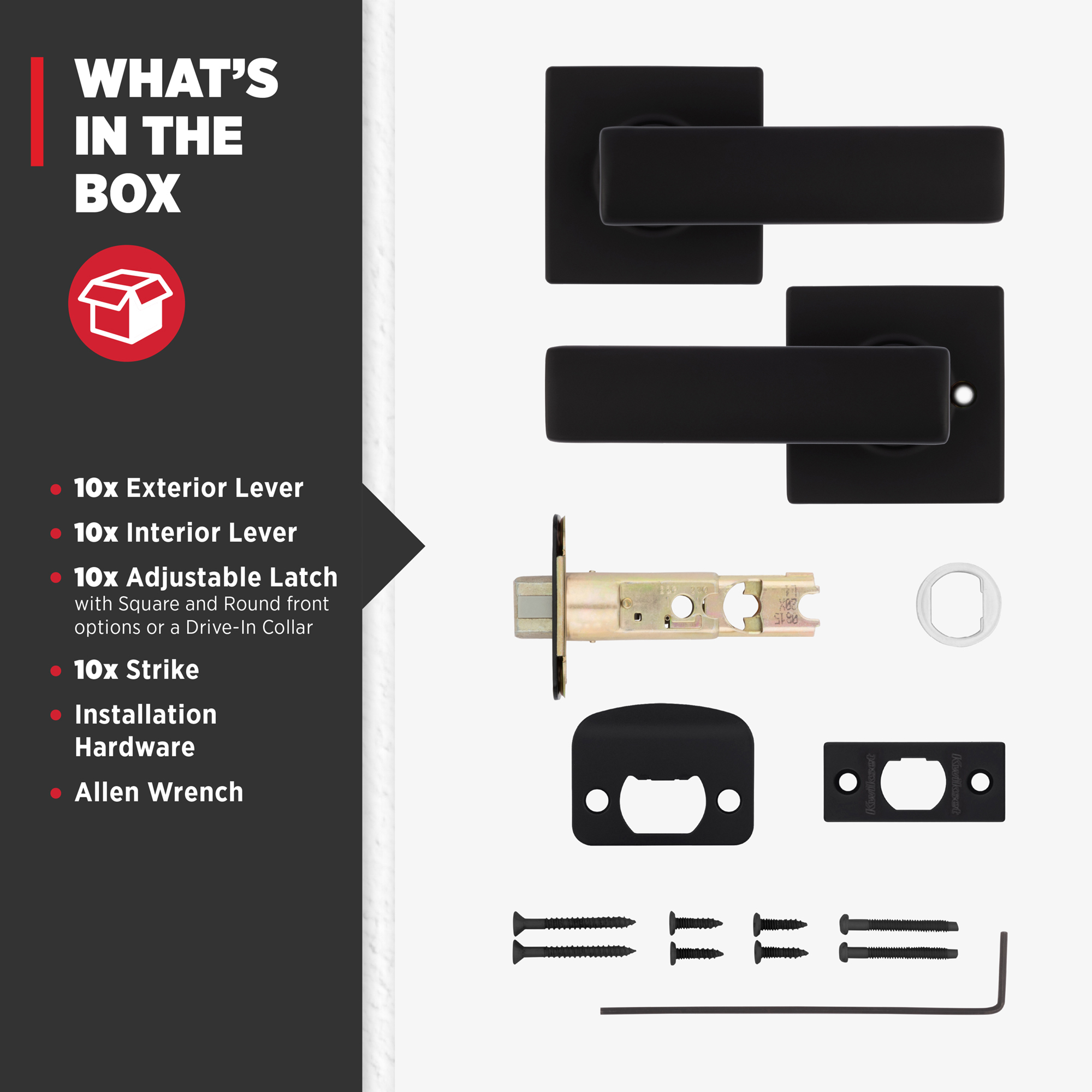 - Box Includes: Box Includes passage lever, Adjustable Latch with round and square front options or drive-in collar, round corner strike, designer rosette, screws and Allen wrench