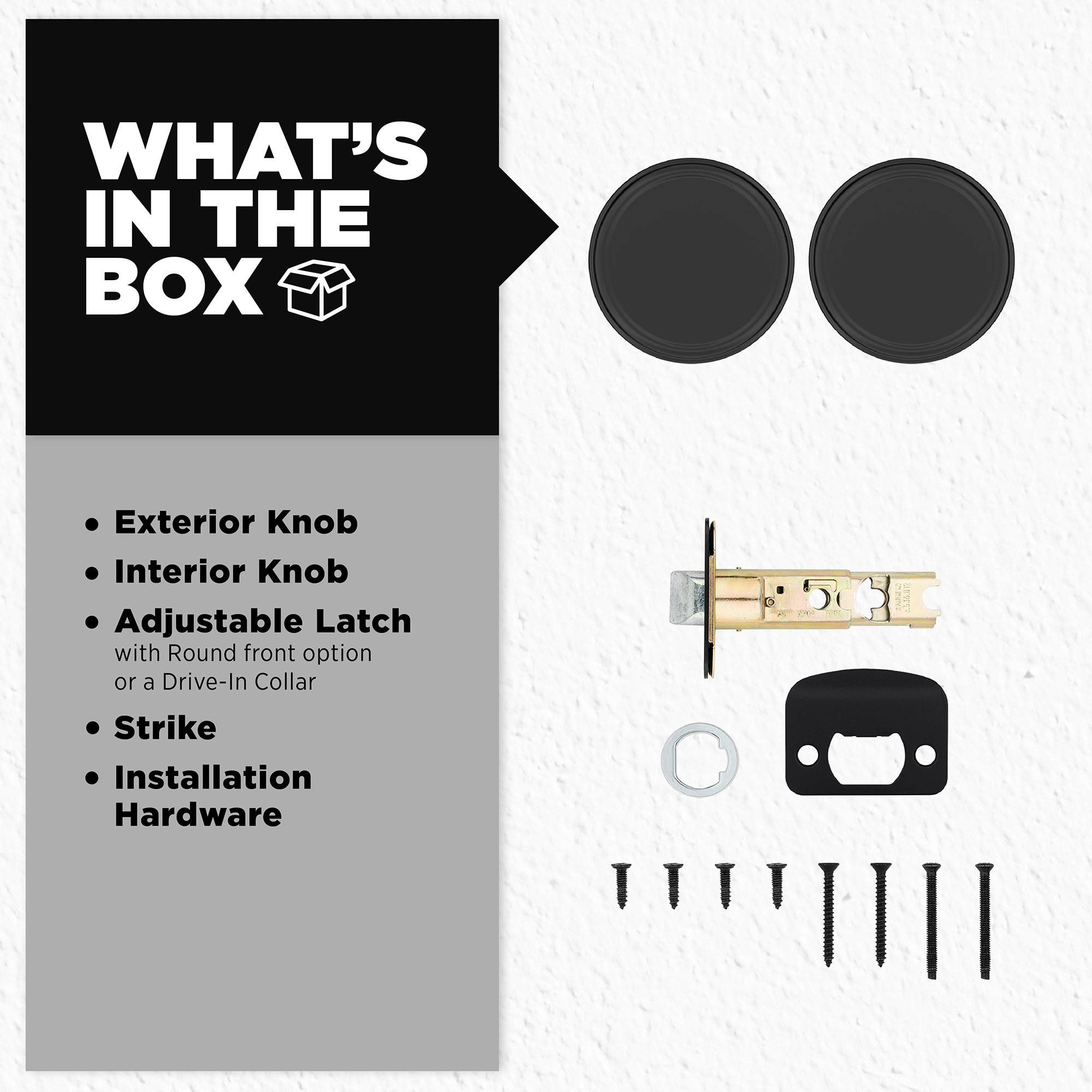 Box Includes: Box includes passage knob, adjustable latch with round and square front options or drive-in collar, round corner strike, designer rosette, screws and Allen wrench