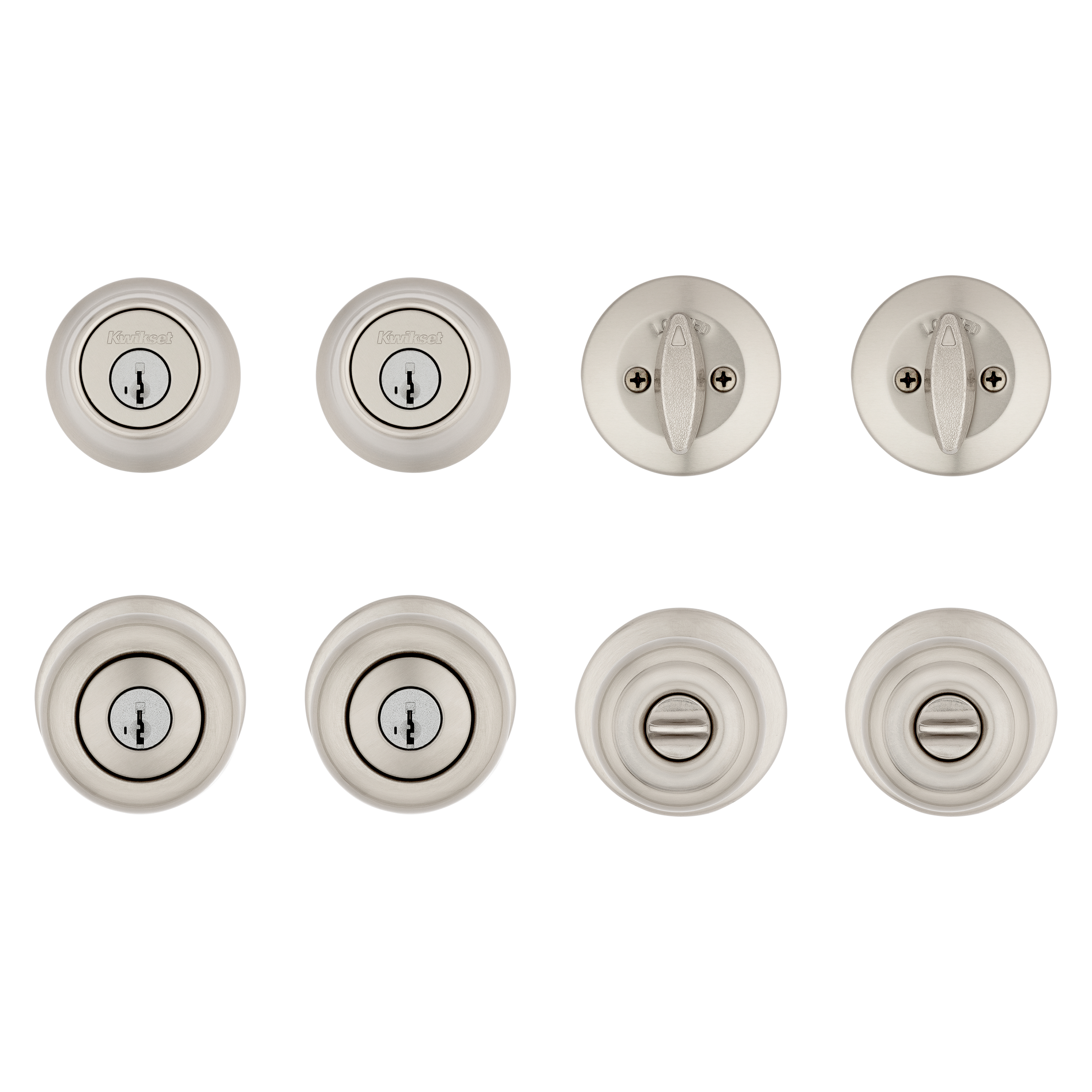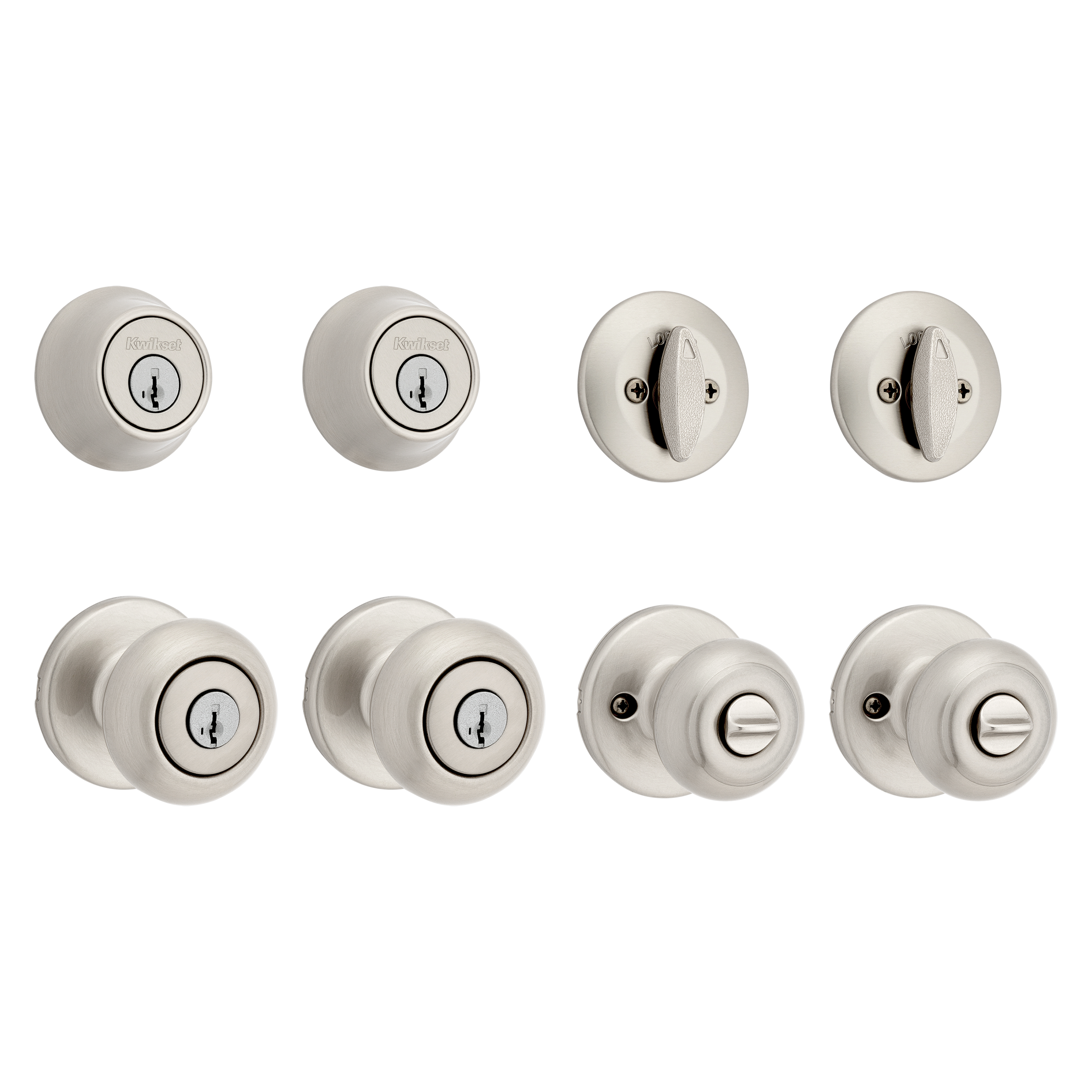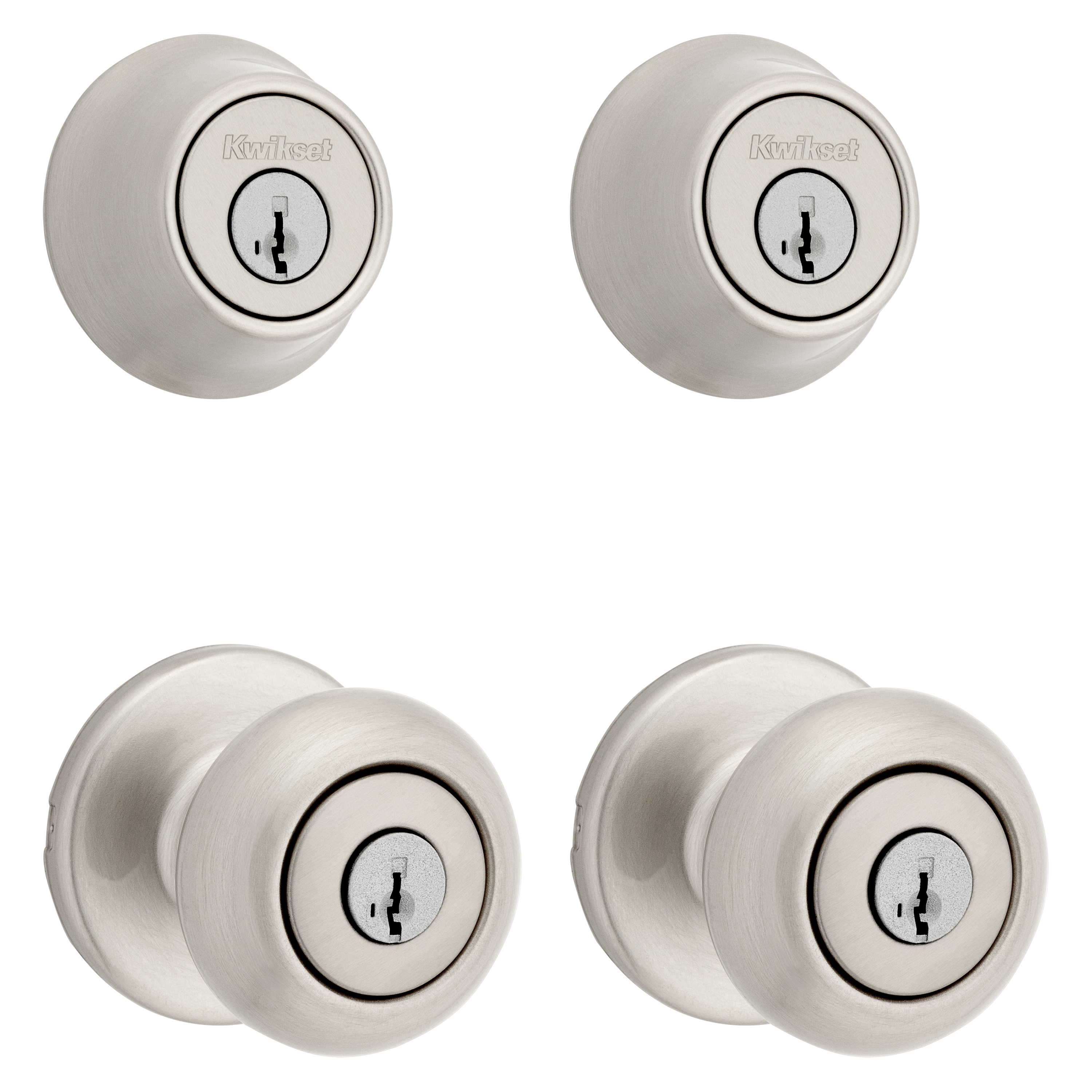 - Box Includes: Box Includes deadbolt, knob, Adjustable Latches with round and square front options or drive-in collar, round corner strikes, SmartKey tool, 2 Kwikset keys, screws and Allen wrench