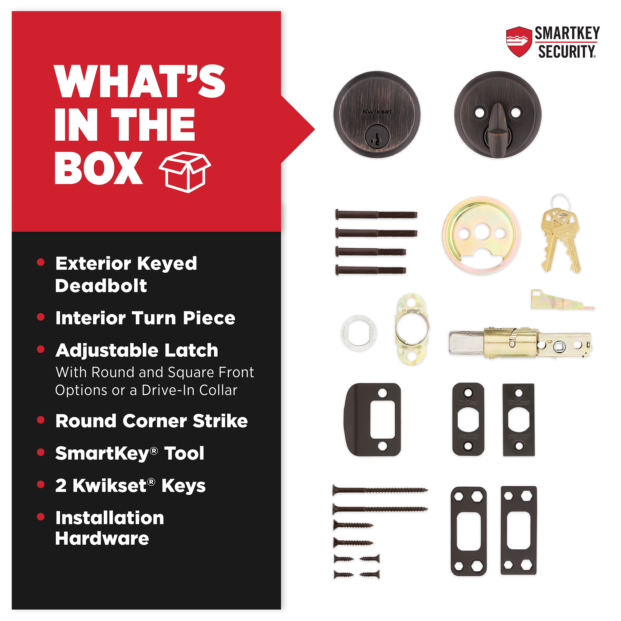SmartKey Security™ re-key technology is compatible with Kwikset (KW1) keyway or (SC1) keyway options