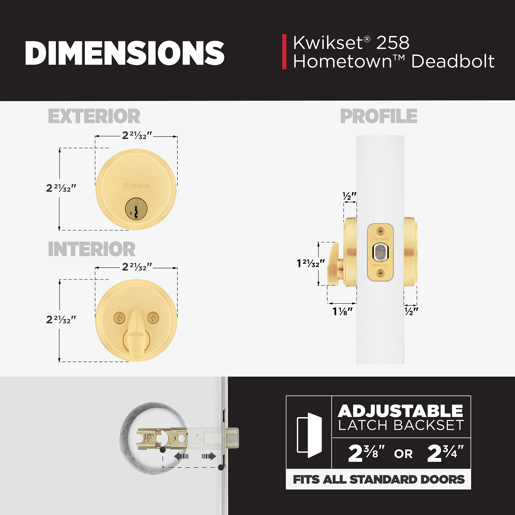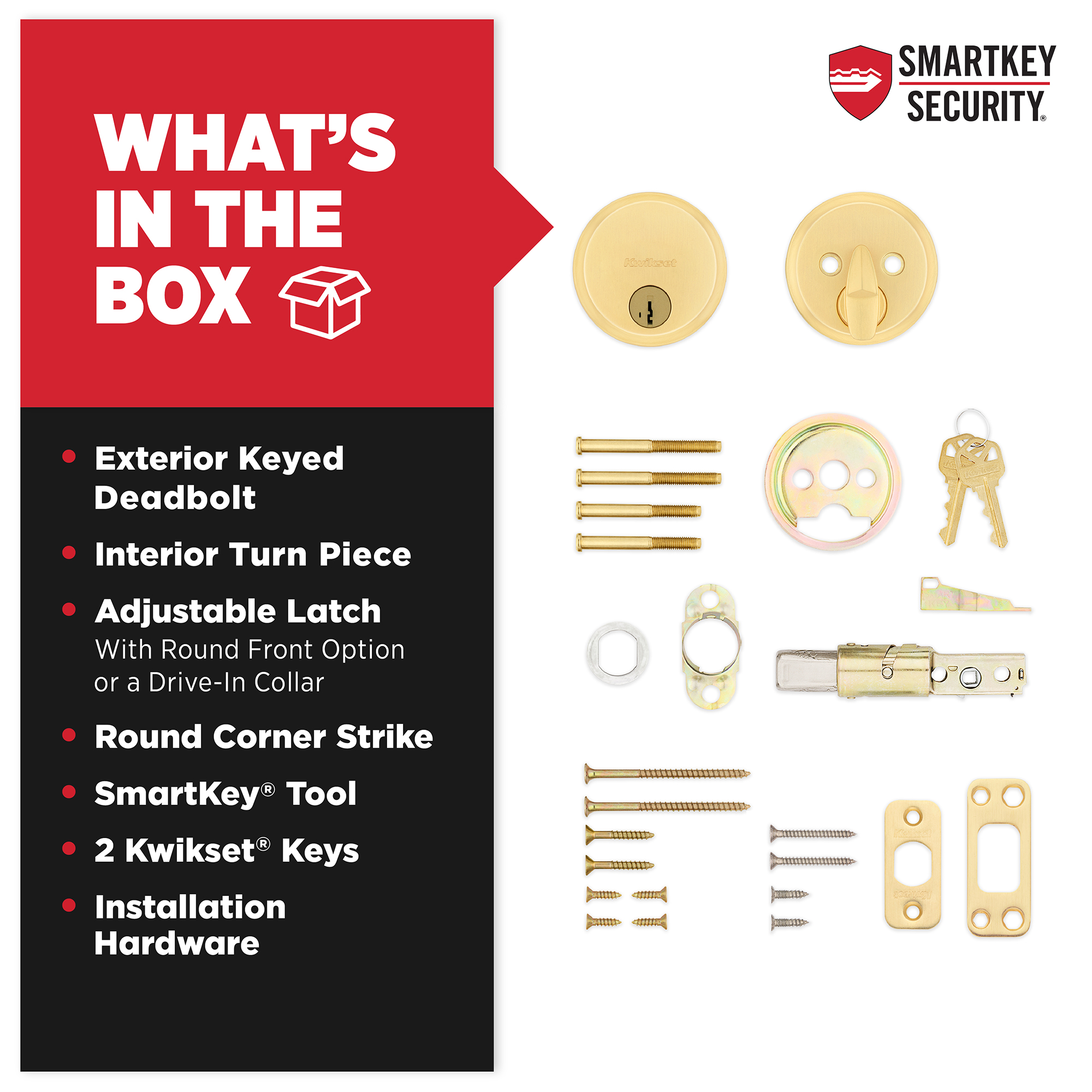 - Box Includes: Exterior Keyed Deadbolt, interior turn piece, Adjustable Latch with round front option or a drive-in collar, strike, SmartKey tool, 2 Kwikset keys and installation hardware