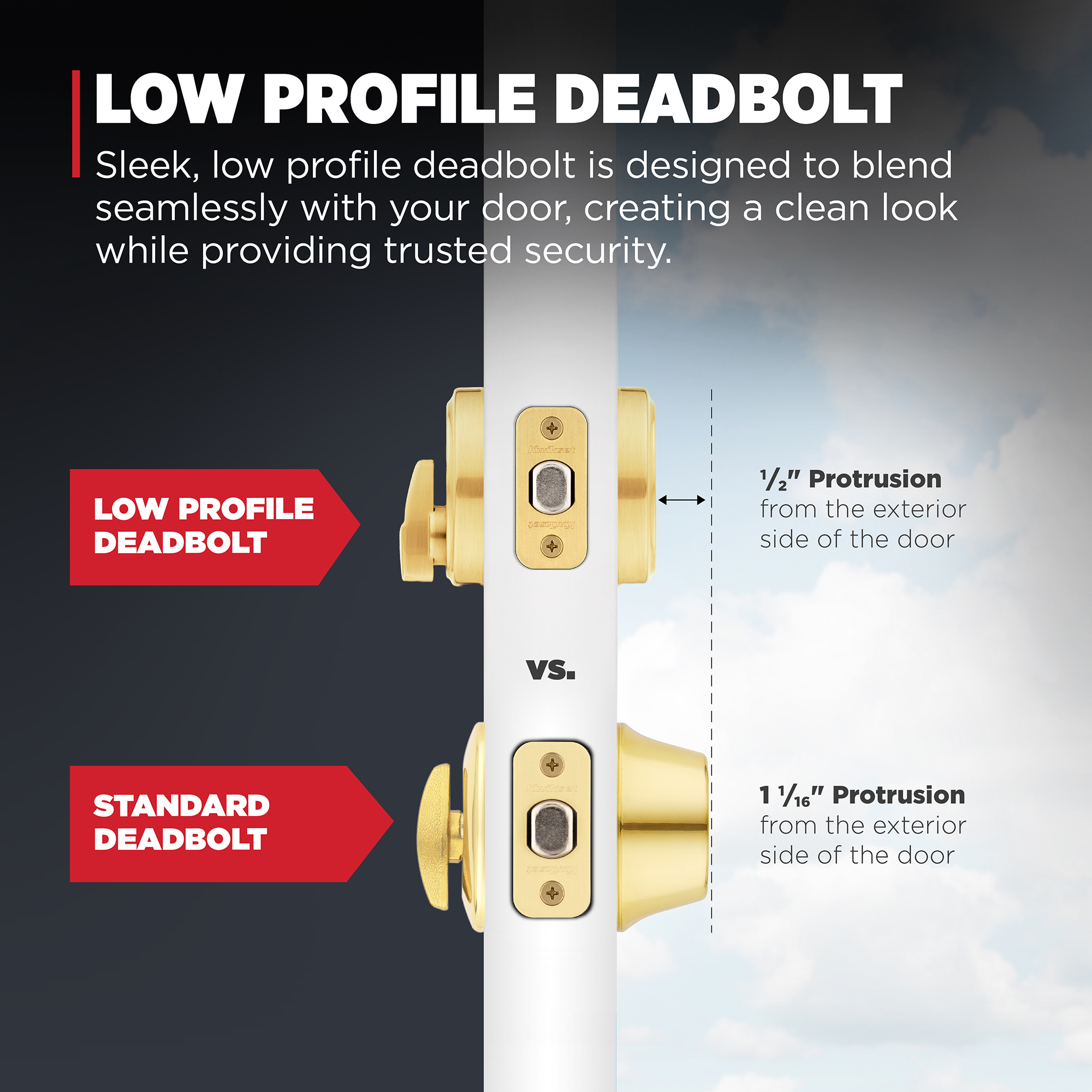 - Low Profile Deadbolt: Sleek, Low Profile Deadbolt is designed to blend seamlessly with your door, creating a clean look while providing the same trusted security as a standard deadbolt