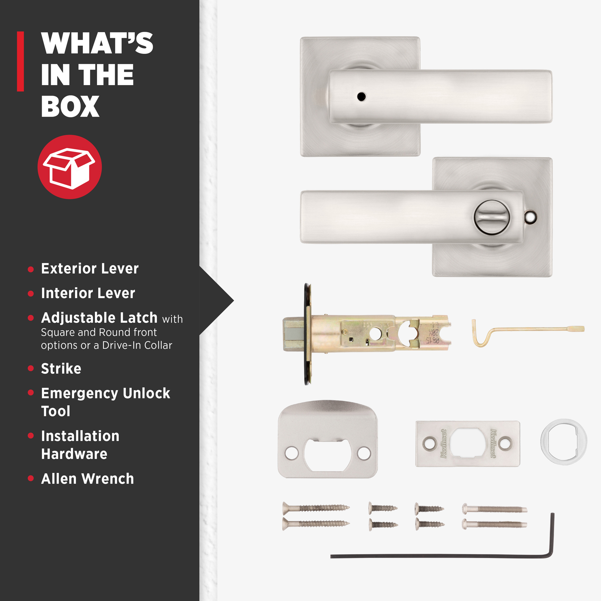 - Box Includes: Box Includes privacy lever, Adjustable Latch with round and square front options or drive-in collar, round corner strike, designer rosette, screws and Allen wrench