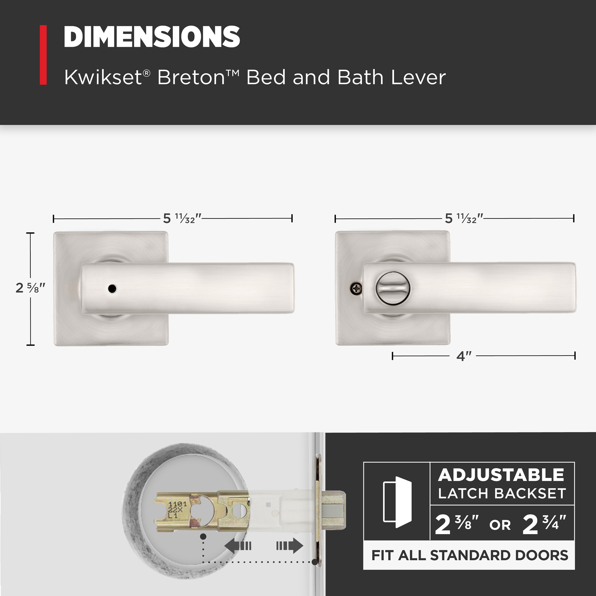 - Fits Standard Doors: Fits standard size doors 1-3/8" to 1-3/4" thick, latch backset adjusts to either 2-3/8" or 2-3/4" by sliding the adjustment pin during installation