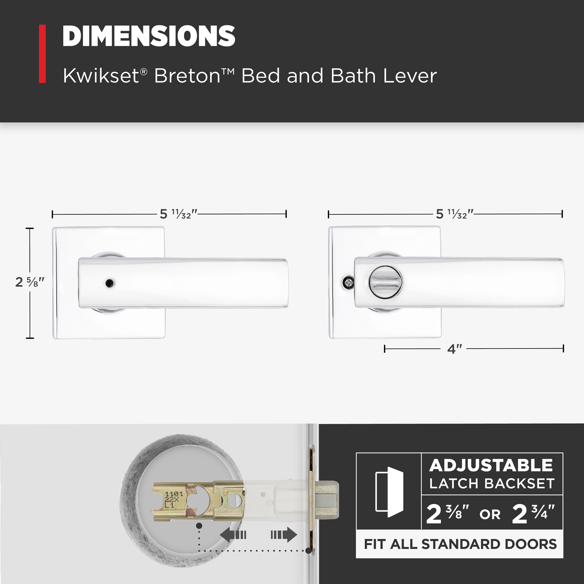 - Fits Standard Doors: Fits standard size doors 1-3/8" to 1-3/4" thick, latch backset adjusts to either 2-3/8" or 2-3/4" by sliding the adjustment pin during installation