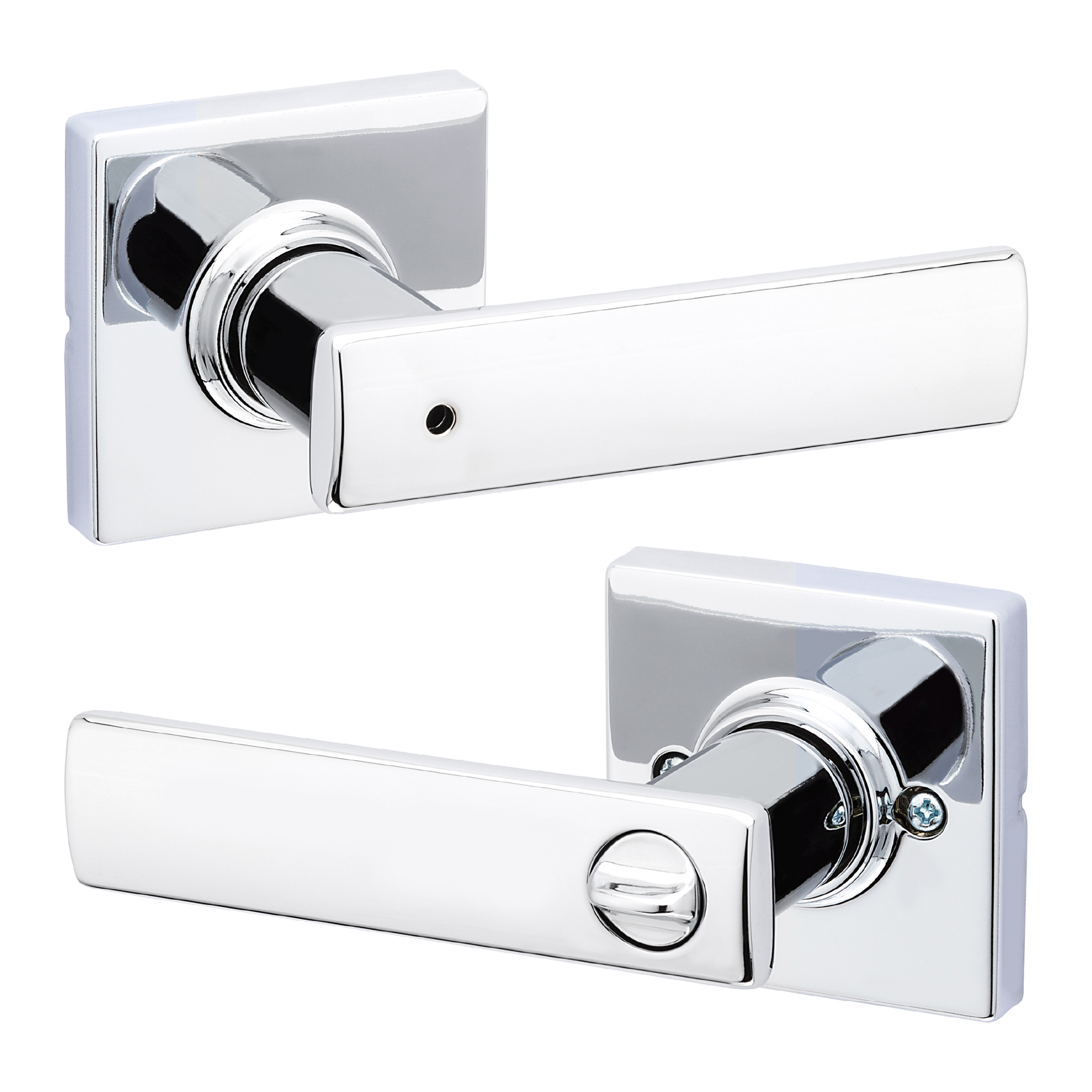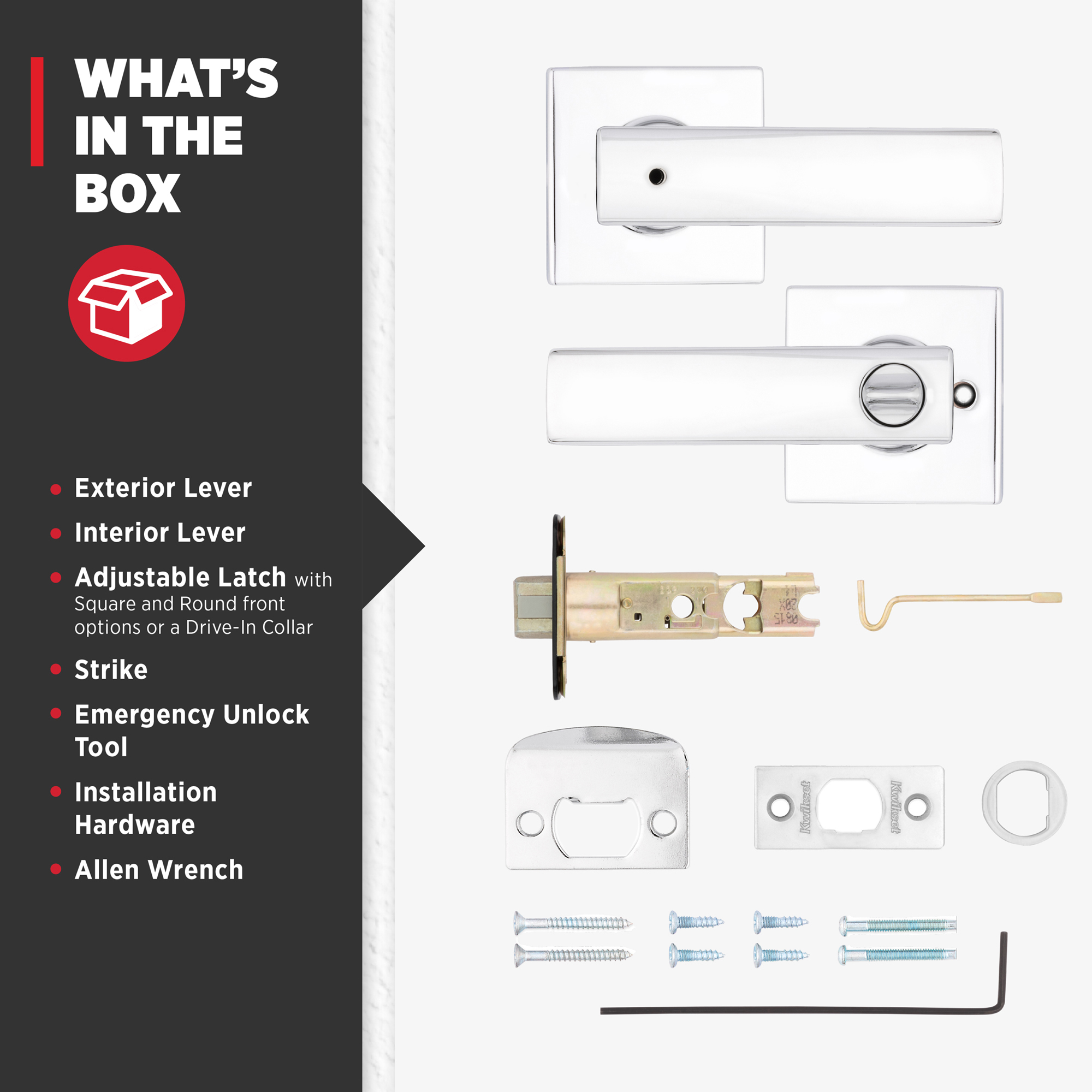 - Box Includes: Box Includes privacy lever, Adjustable Latch with round and square front options or drive-in collar, round corner strike, designer rosette, screws and Allen wrench