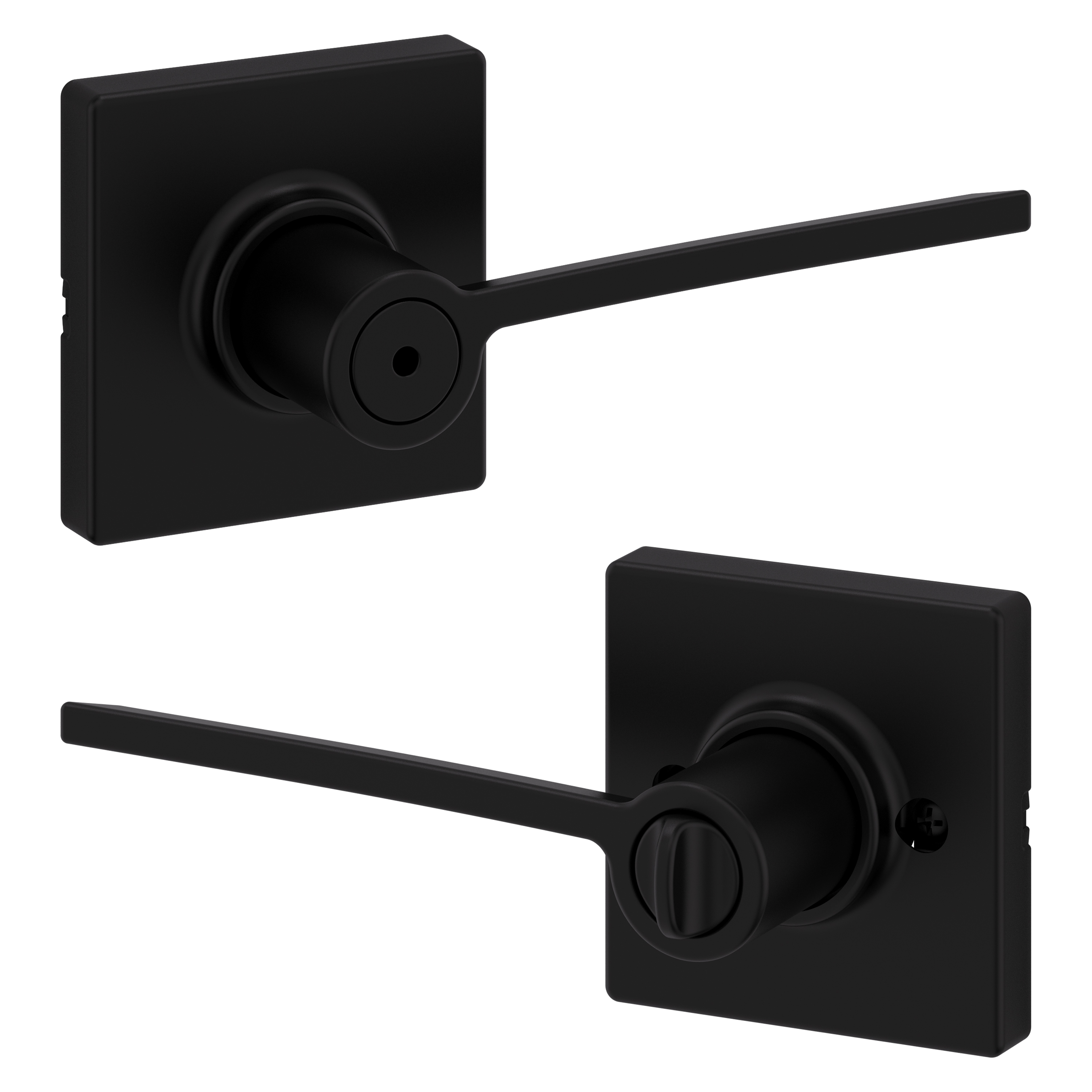 - Box Includes: Box Includes privacy lever, Adjustable Latch with round and square front options or drive-in collar, round corner strike, designer rosette, screws and Allen wrench