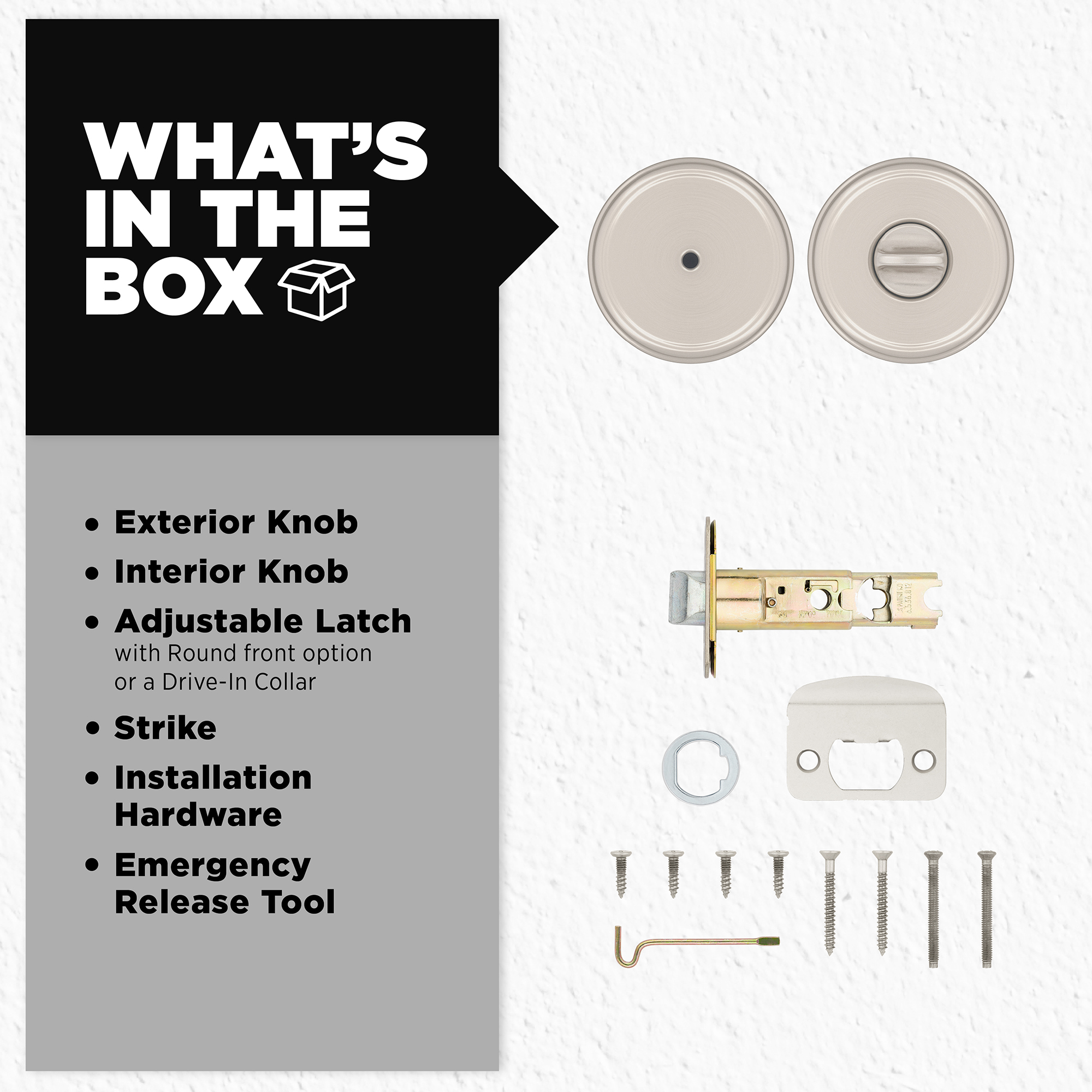 Box Includes: Box includes privacy knob, adjustable latch with round and square front options or drive-in collar, round corner strike, designer rosette, screws and Allen wrench