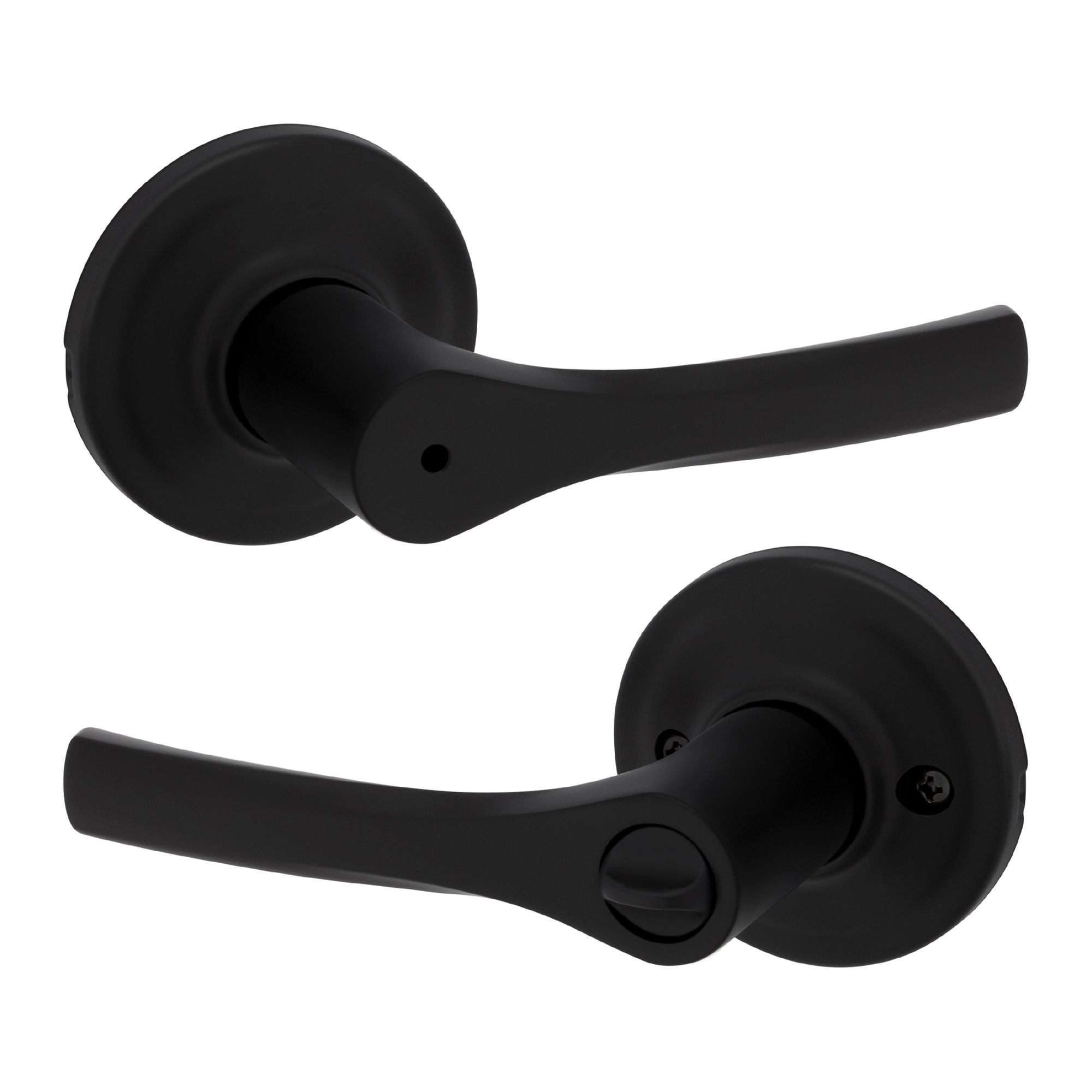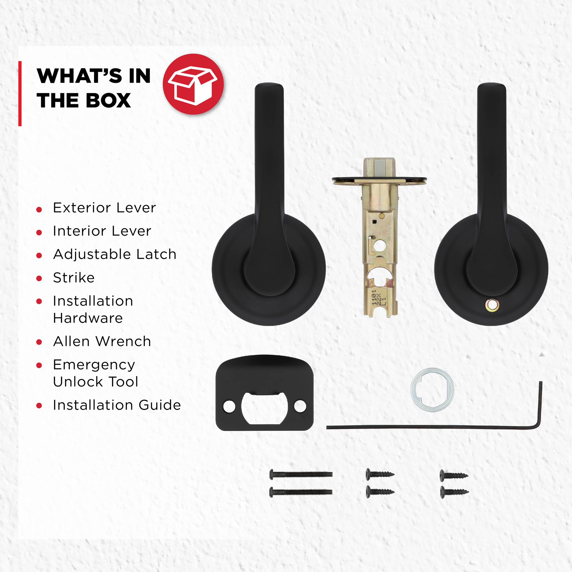 - Box Includes: Box includes privacy lever, adjustable latch with round and square front options or drive-in collar, round corner strike, designer rosette, screws and Allen wrench