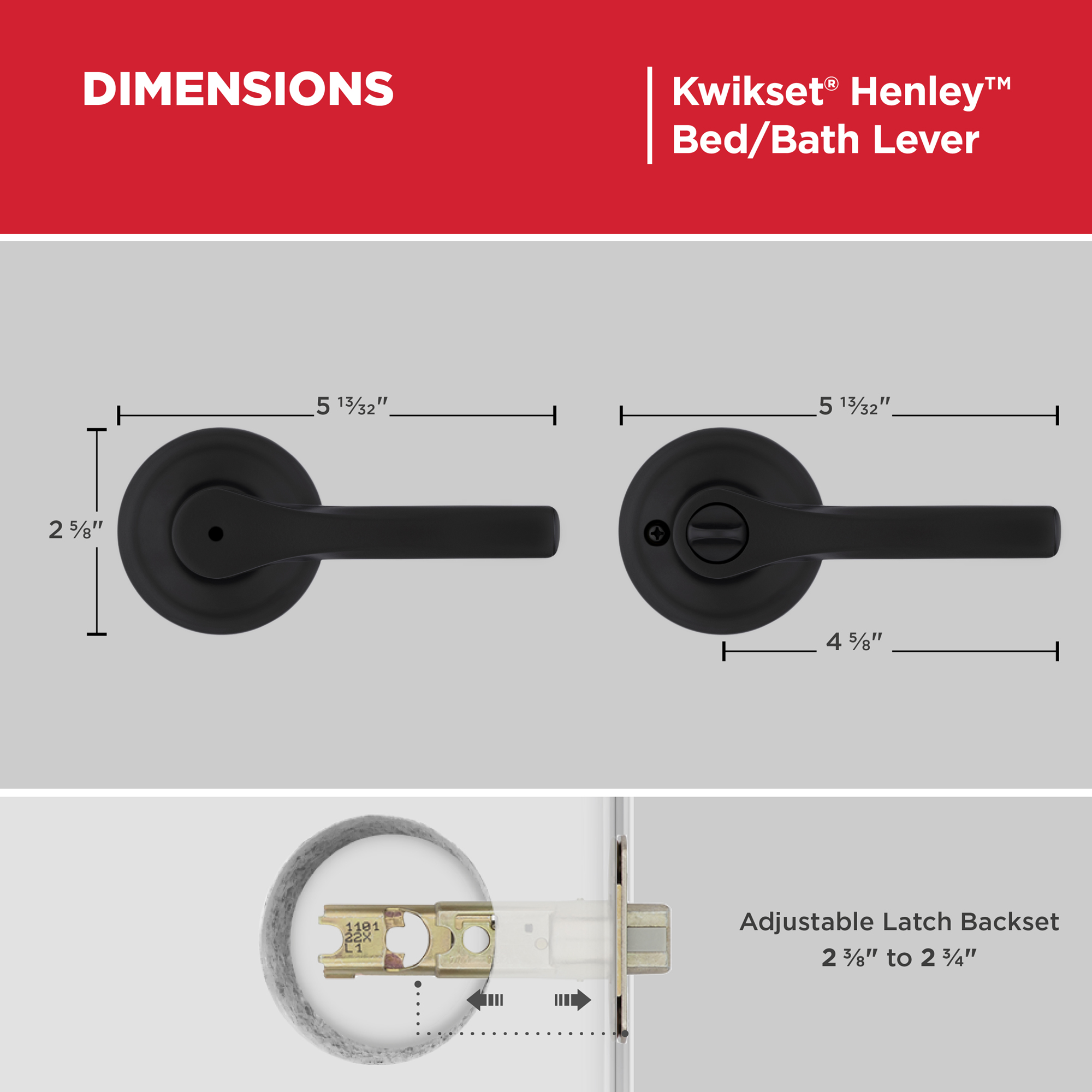 - Fits Standard Doors: Fits standard size doors 1-3/8" to 1-3/4" thick, latch backset adjusts to either 2-3/8" or 2-3/4" by sliding the adjustment pin during installation