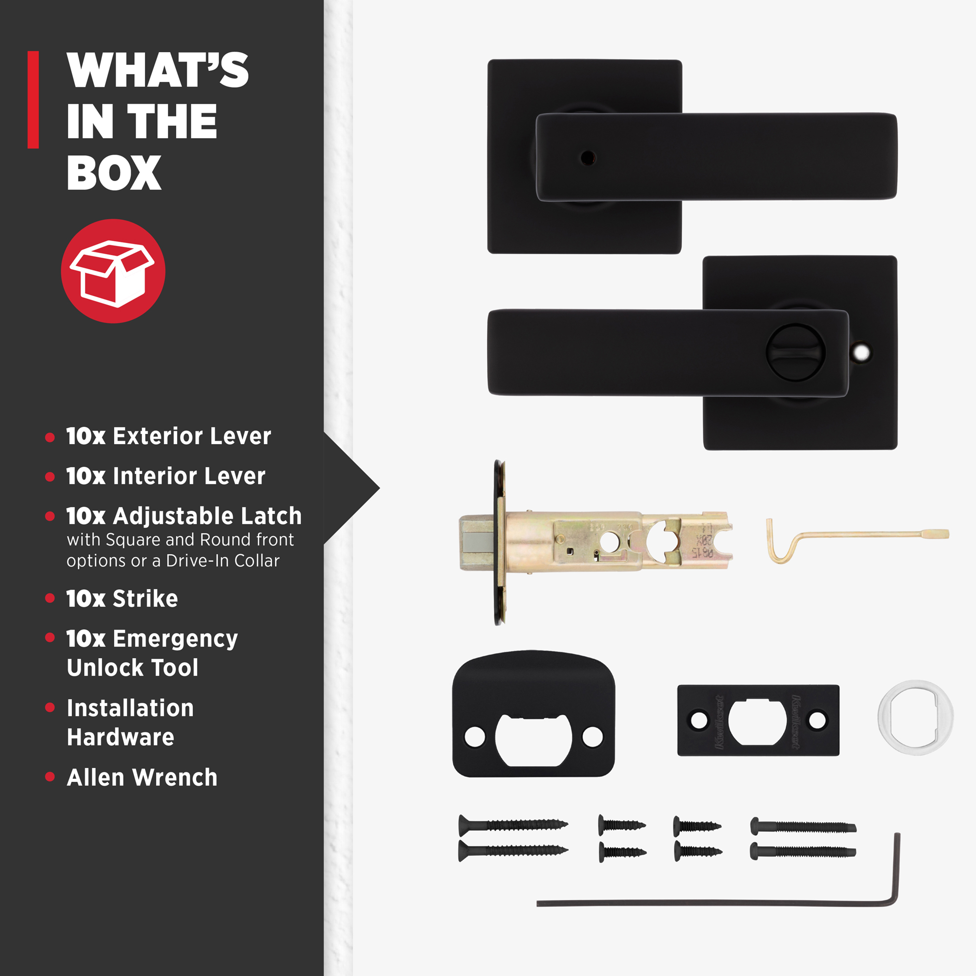 - Box Includes: Box Includes privacy lever, Adjustable Latch with round and square front options or drive-in collar, round corner strike, designer rosette, screws and Allen wrench