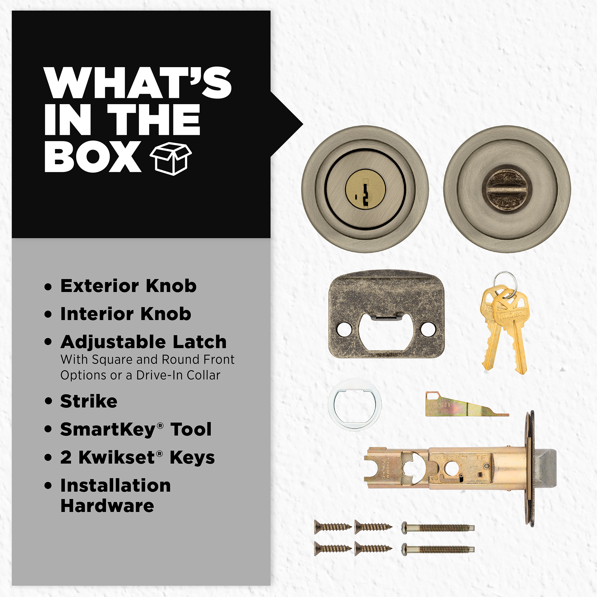 Box Includes: Box includes entry knobs, adjustable latch with round and square front options or drive-in collar, round corner strike, SmartKey® tool, 2 Kwikset keys, designer rosette, screws and Allen wrench