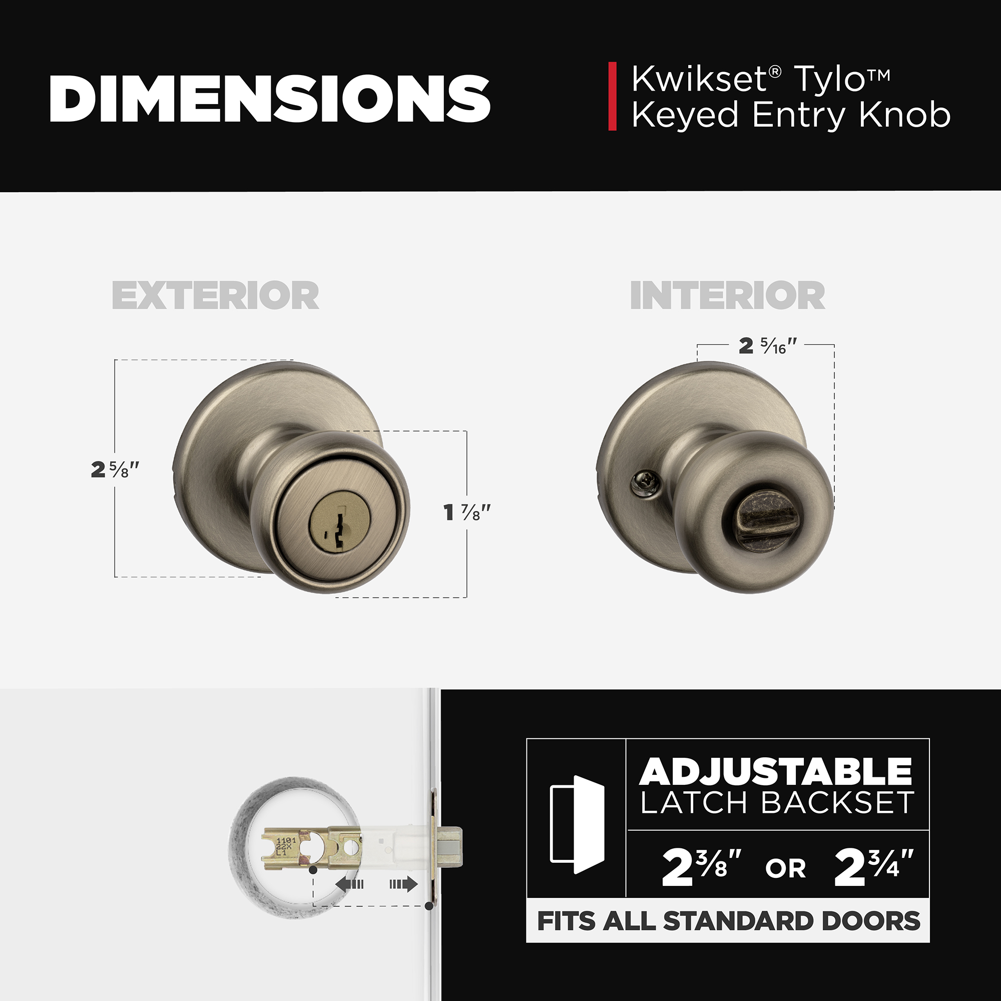 Fits Standard Doors: Fits standard size doors 1-3/8" to 1-3/4" thick, latch backset adjusts to either 2-3/8" or 2-3/4" by sliding the adjustment pin during installation