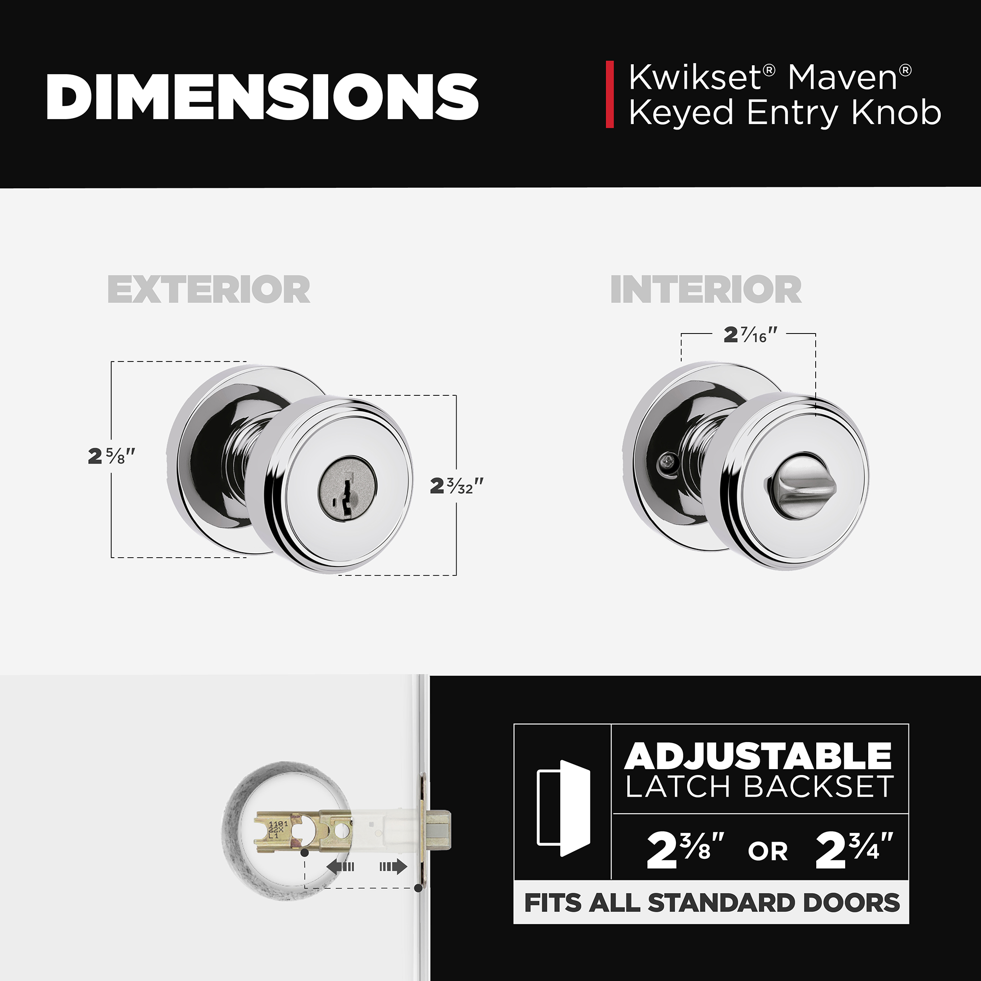 FITS STANDARD DOORS: Fits standard size doors 1-3/8" to 1-3/4" thick, latch backset adjusts to either 2-3/8" or 2-3/4" with just a twist during installation