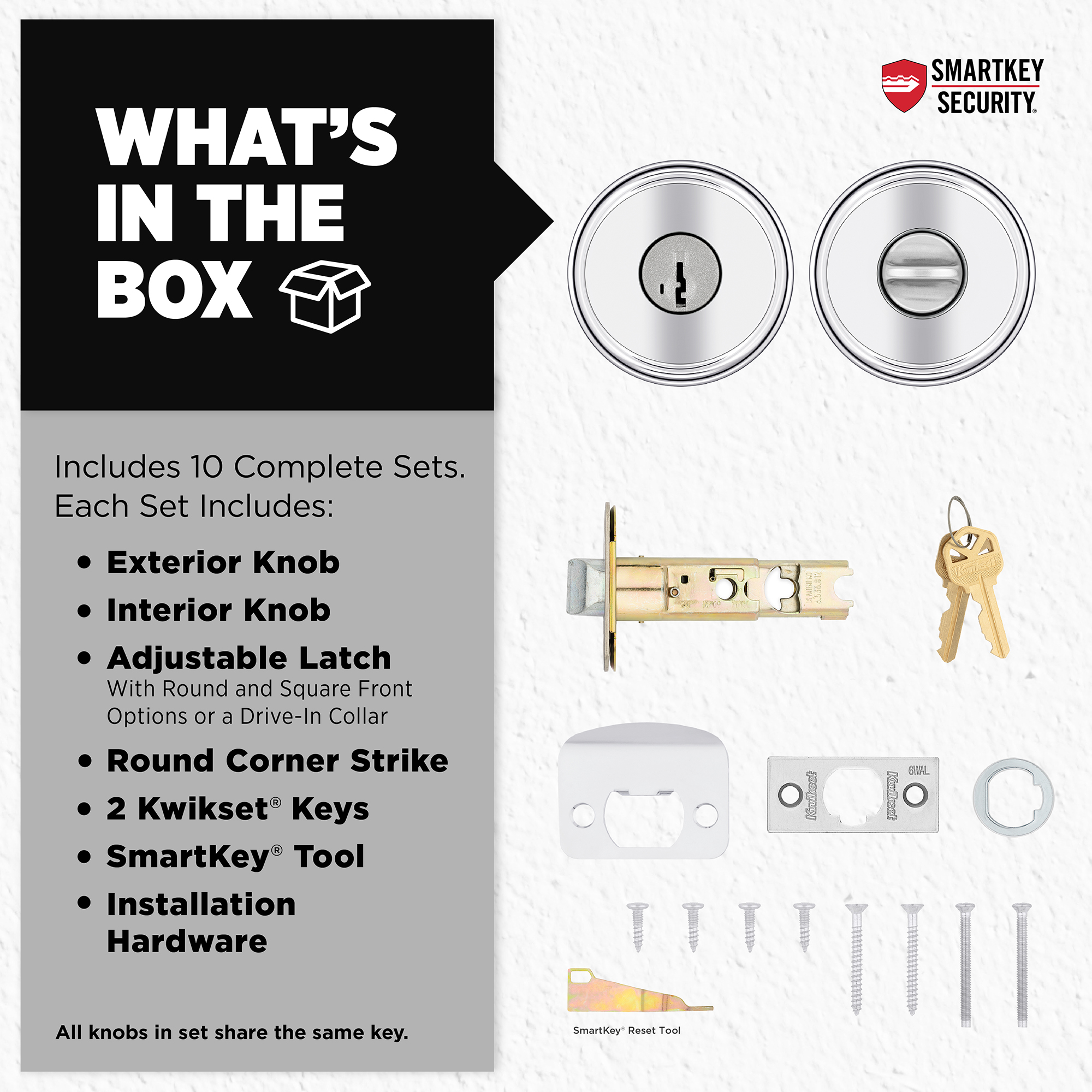 BOX INCLUDES: 10 Entry levers, latch with round and square front options or drive-in collar, strike, SmartKey tool, 2 Kwikset keys, rosette, screws and Allen wrench