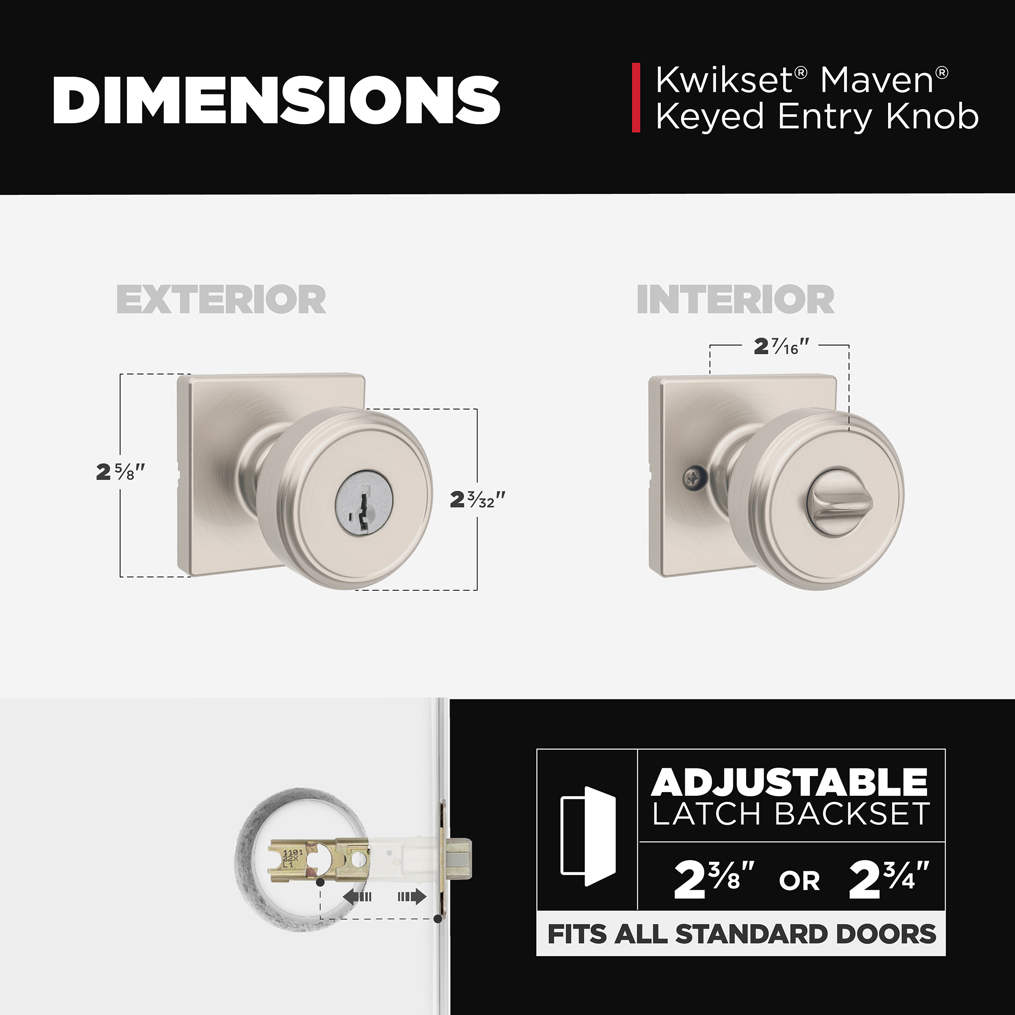 FITS STANDARD DOORS: Fits standard size doors 1-3/8" to 1-3/4" thick, latch backset adjusts to either 2-3/8" or 2-3/4" with just a twist during installation