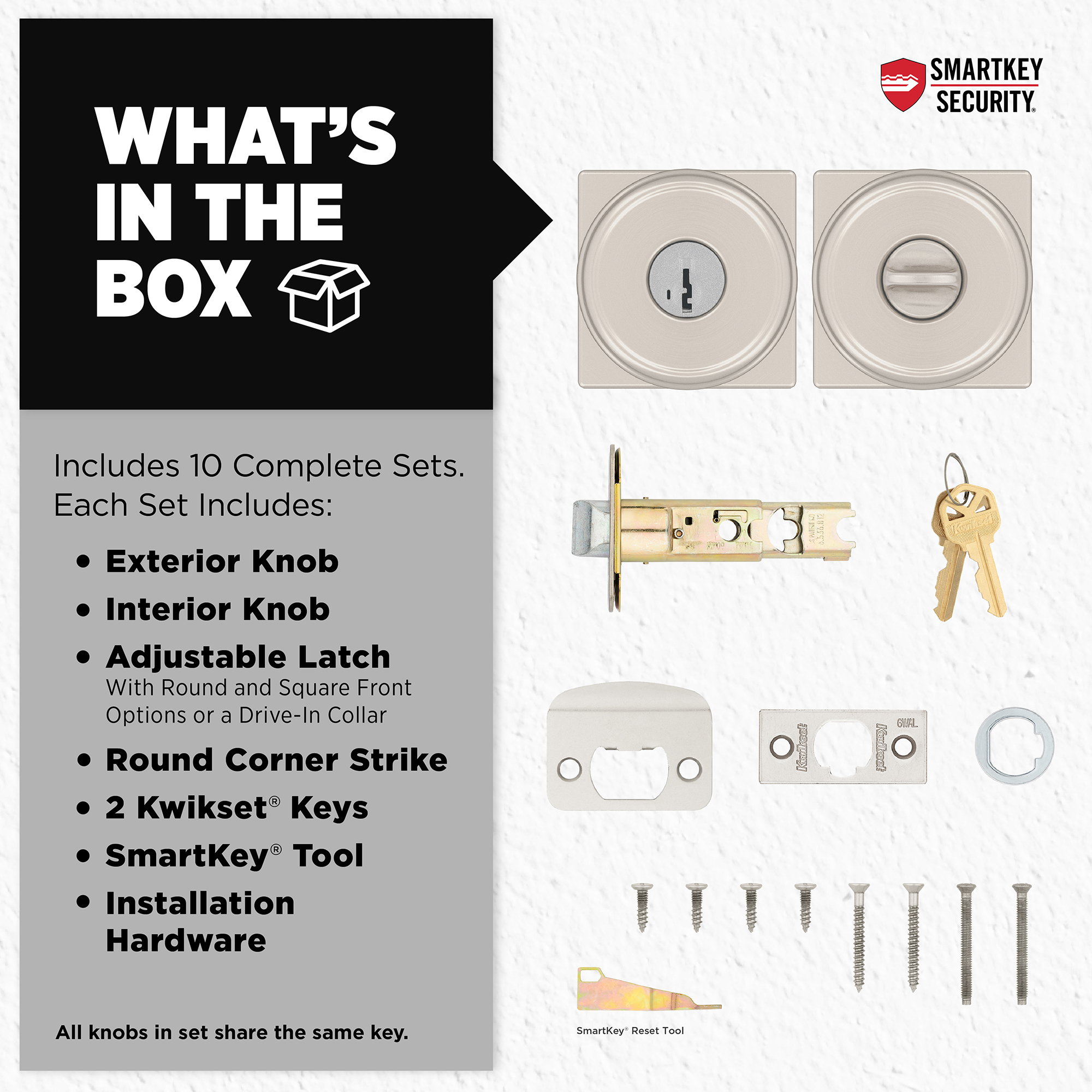 BOX INCLUDES: 10 Entry levers, latch with round and square front options or drive-in collar, strike, SmartKey tool, 2 Kwikset keys, rosette, screws and Allen wrench