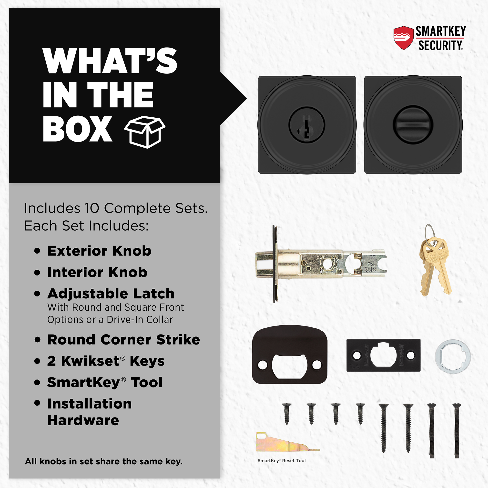 BOX INCLUDES: 10 Entry levers, latch with round and square front options or drive-in collar, strike, SmartKey tool, 2 Kwikset keys, rosette, screws and Allen wrench