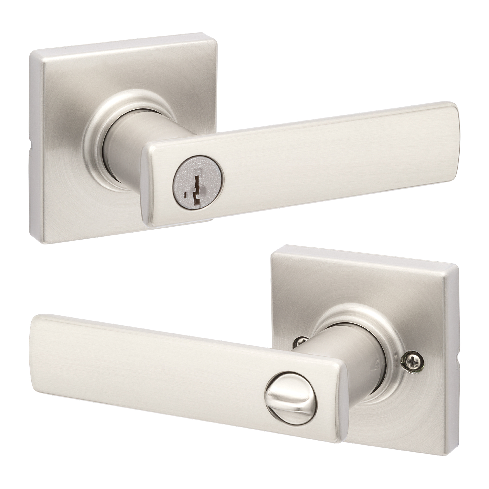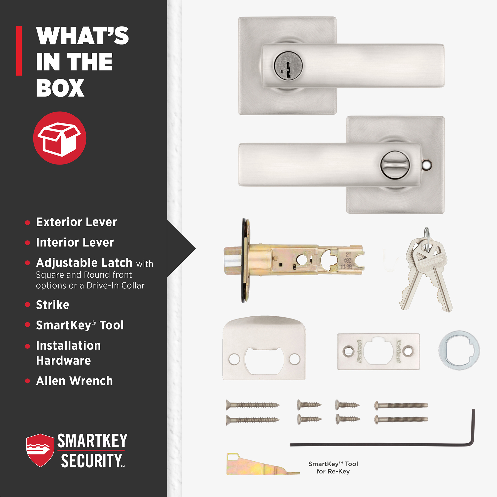 Box Includes: Box Includes entry levers, Adjustable Latch with round and square front options or drive-in collar, round corner strike, SmartKey tool, 2 Kwikset keys, designer rosette, screws and Allen wrench
