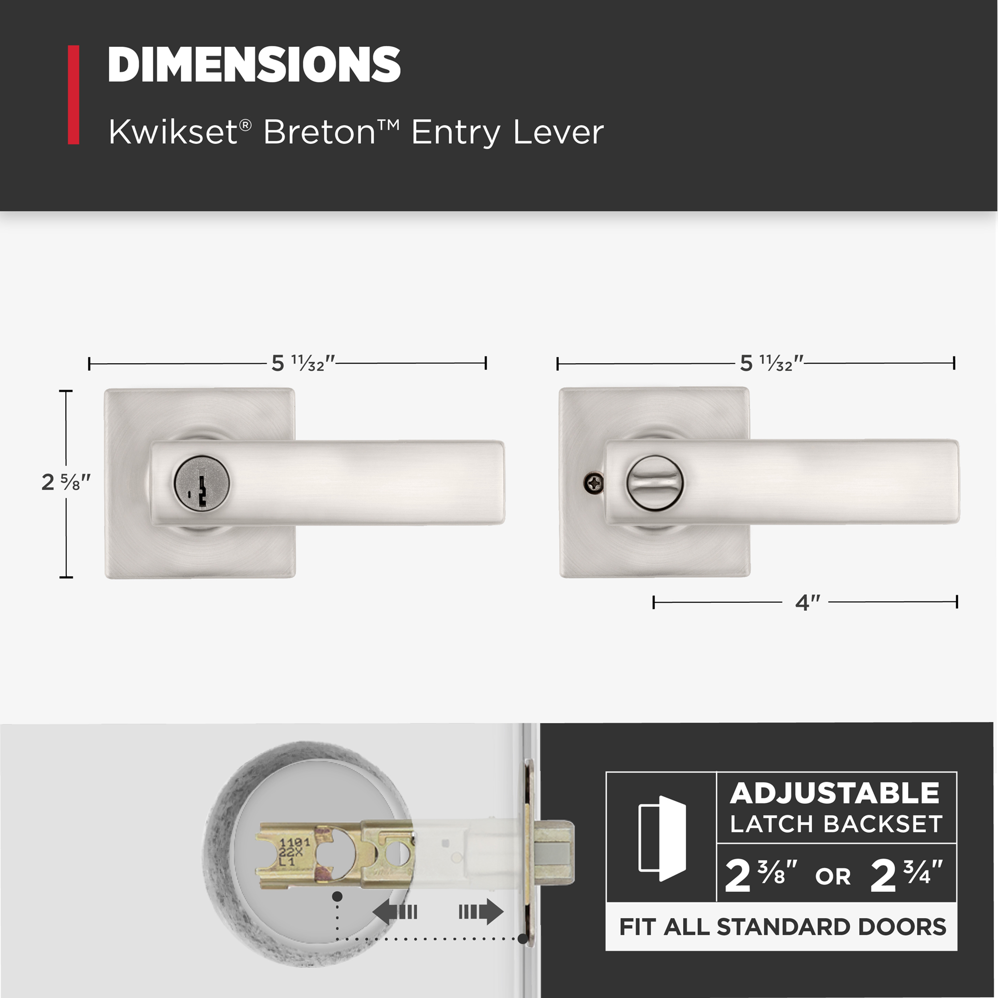 Latch has adjustable backset 2-3/8" to 2-3/4" to fit all standard door preparations