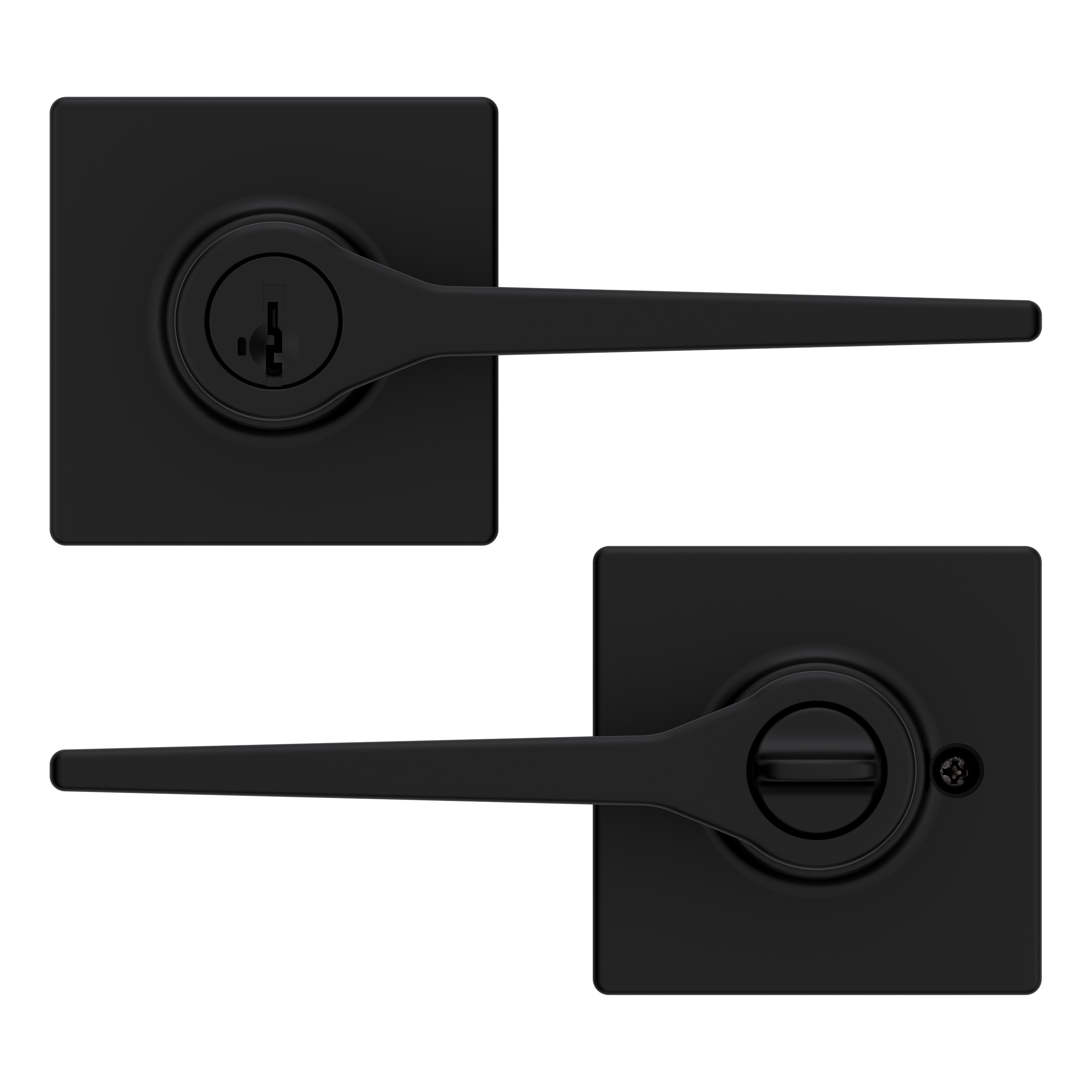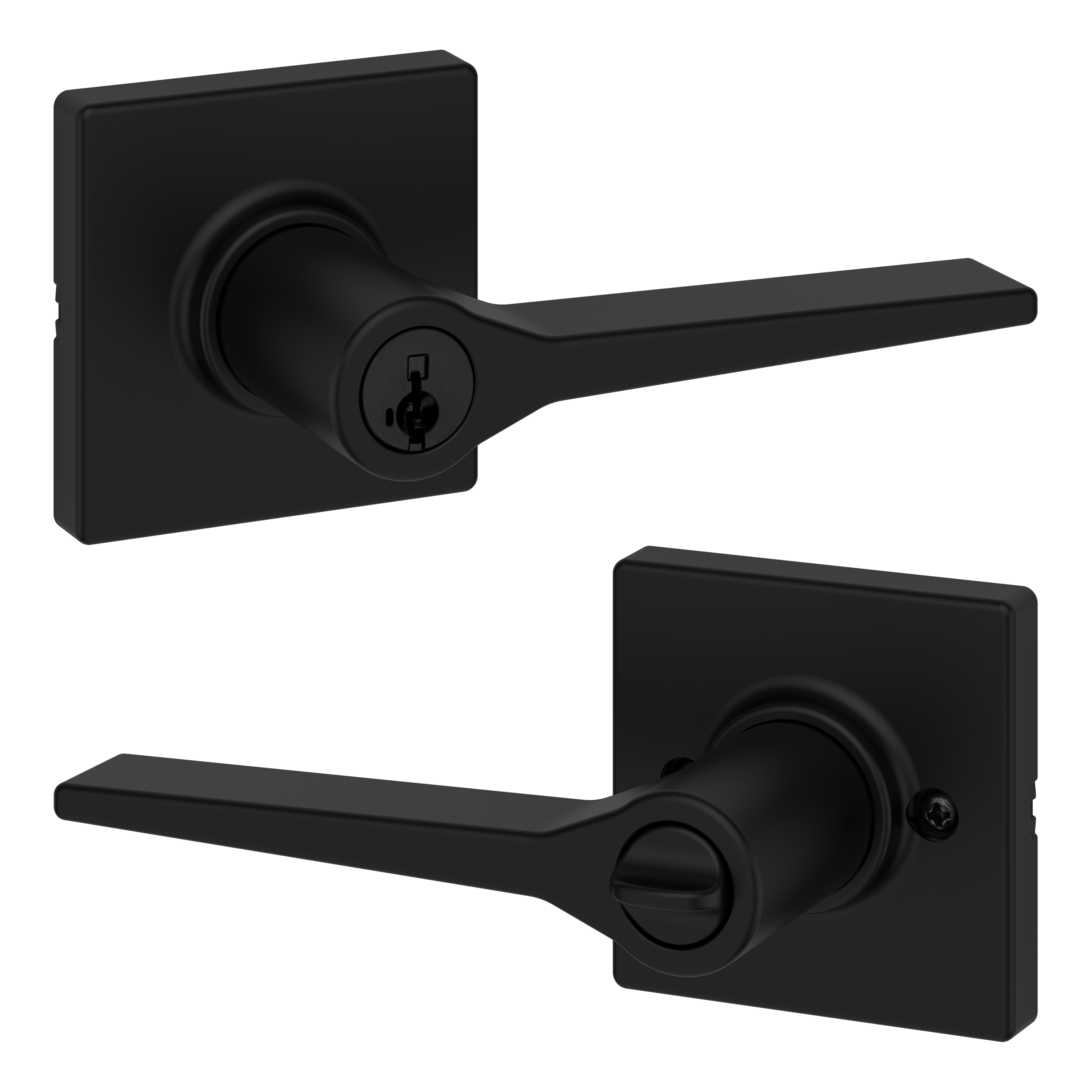 Box Includes: Box Includes entry levers, Adjustable Latch with round and square front options or drive-in collar, round corner strike, SmartKey tool, 2 Kwikset keys, designer rosette, screws and Allen wrench