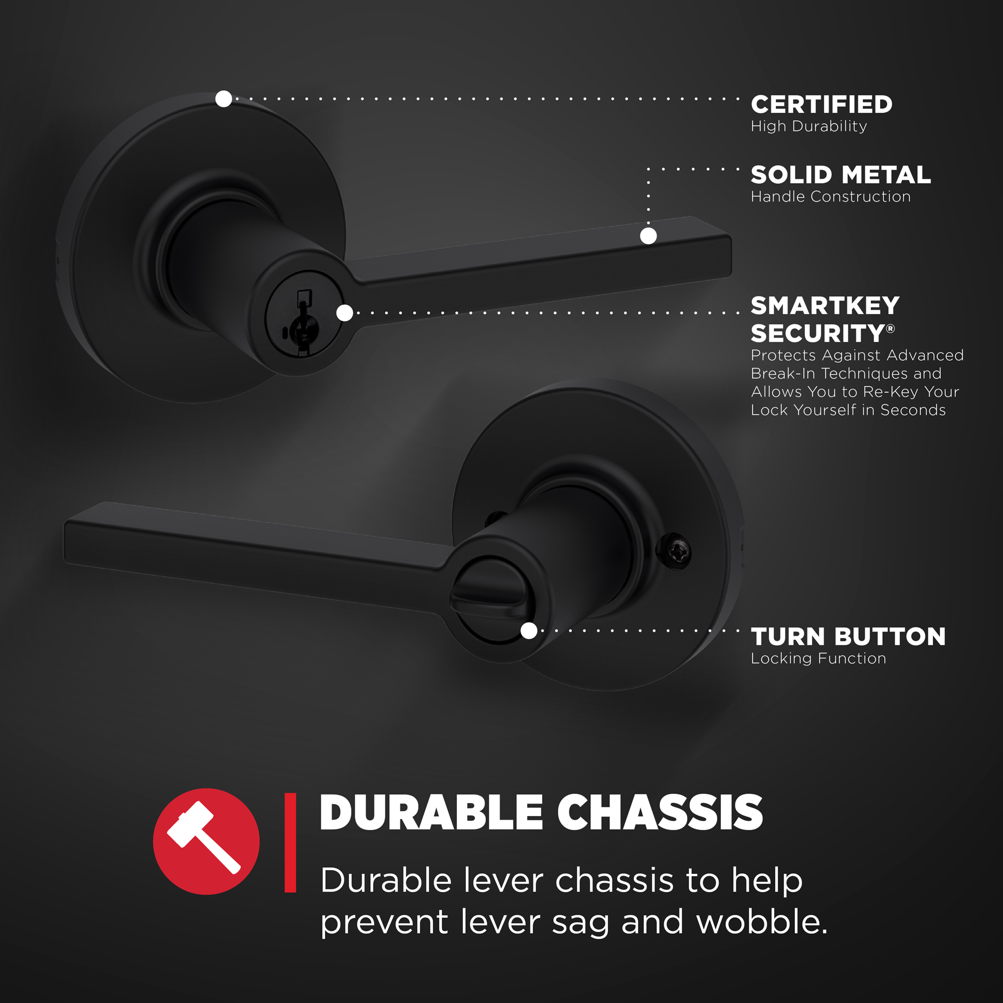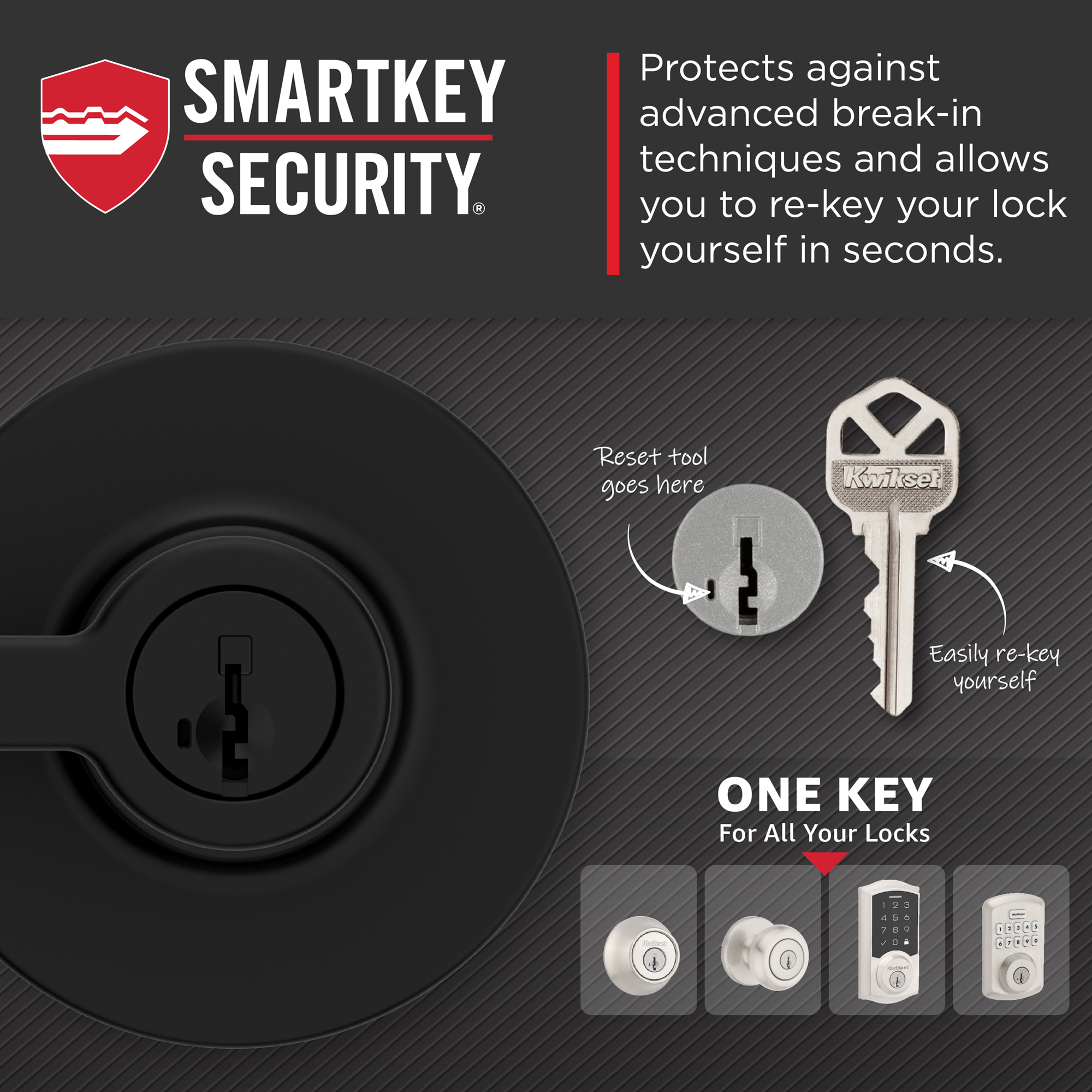 - SMARTKEY SECURITY: Kwikset’s SmartKey Security technology protects against advanced break-in techniques and allows you to re-key your lock yourself in seconds