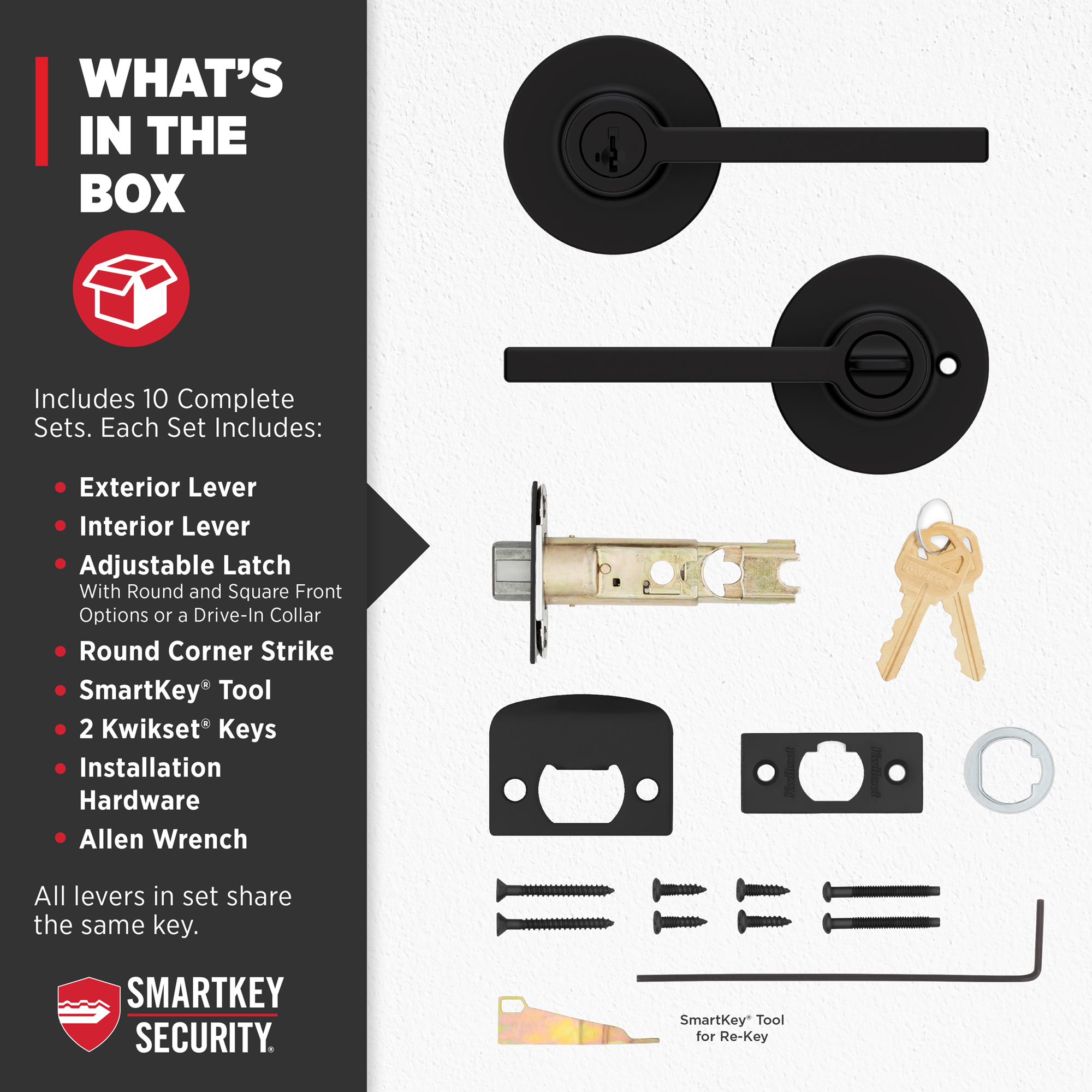 - BOX INCLUDES: 10 Entry levers, latch with round and square front options or drive-in collar, strike, SmartKey tool, 2 Kwikset keys, rosette, screws and Allen wrench