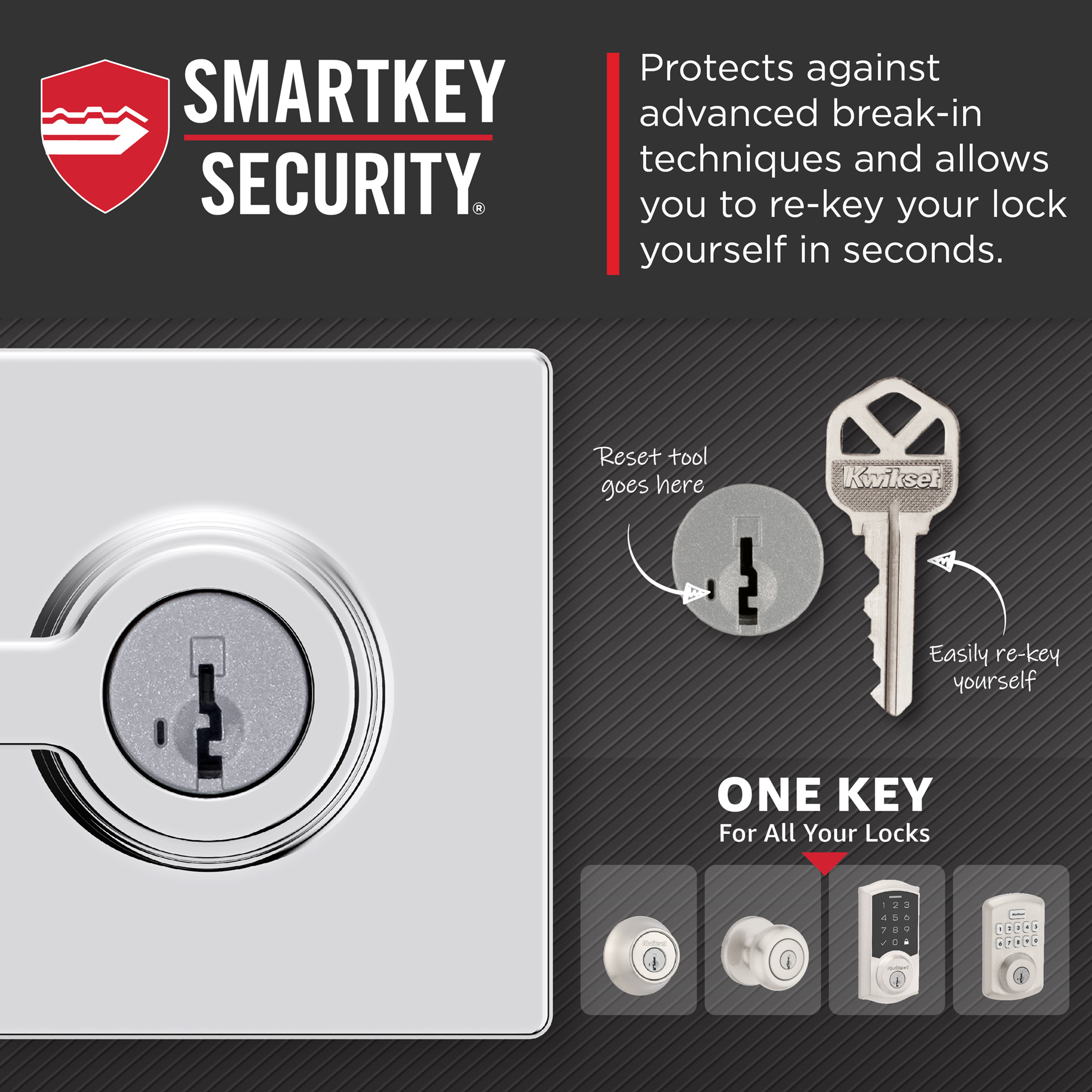 SMARTKEY SECURITY: Kwikset’s SmartKey Security technology protects against advanced break-in techniques and allows you to re-key your lock yourself in seconds
