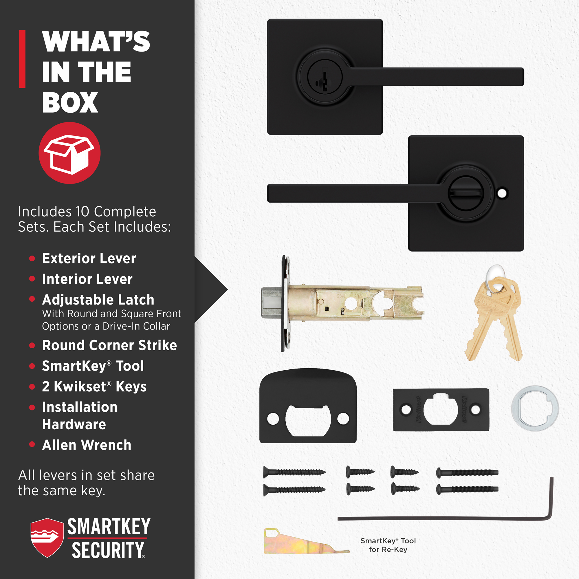BOX INCLUDES: 10 Entry levers, latch with round and square front options or drive-in collar, strike, SmartKey tool, 2 Kwikset keys, rosette, screws and Allen wrench