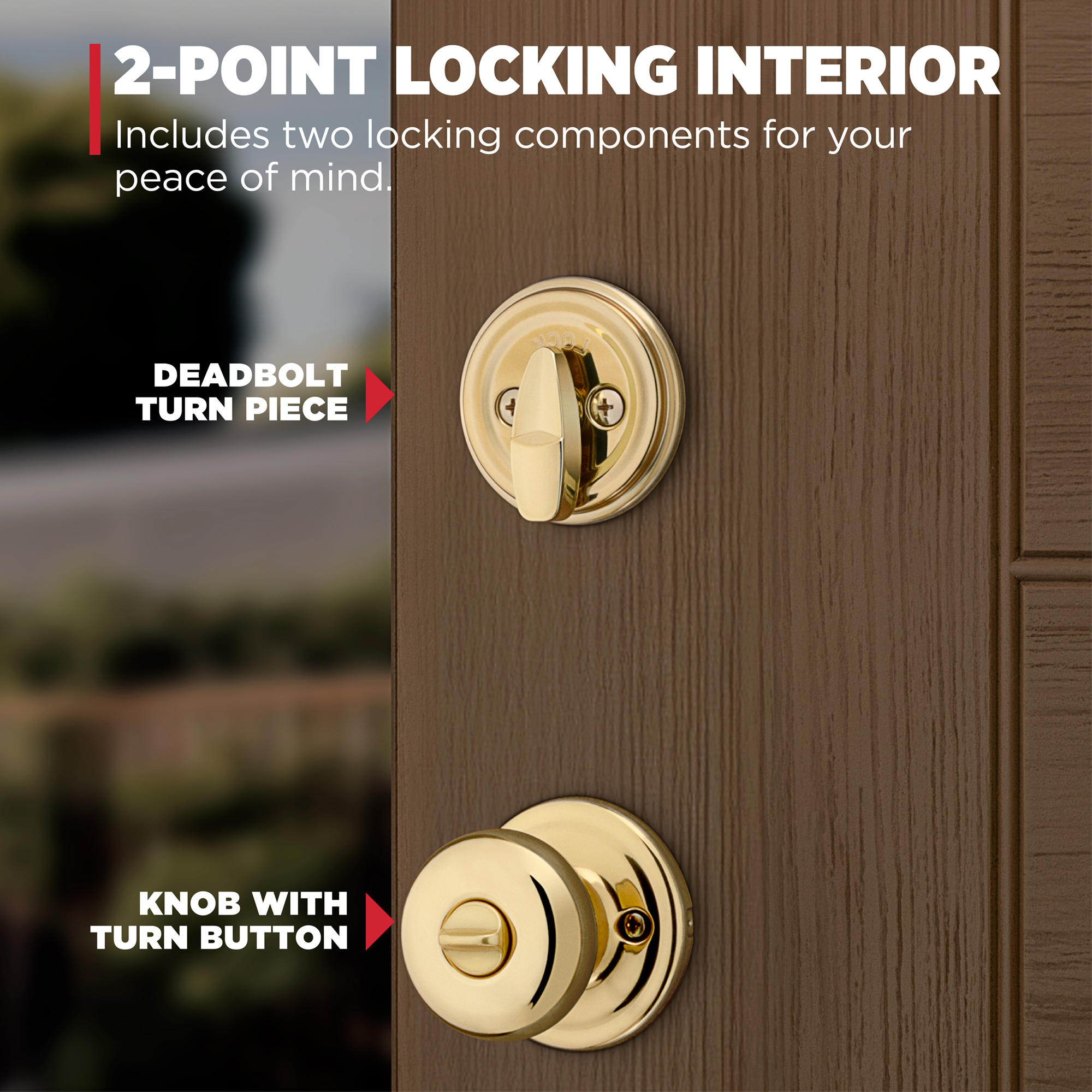 2-Point Locking Interior: Interior includes a deadbolt turn piece and knob with turn button, offering two locking components for your peace of mind